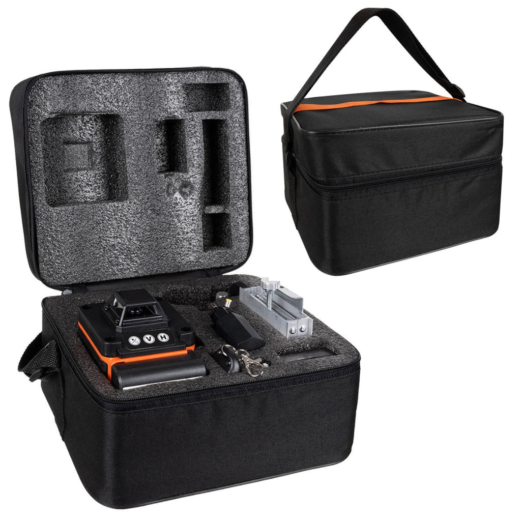 * Nivelliir ning kõik lisaseadmed on väga mugavas sangaga kotikeses, kus iga eseme jaoks on oma koht. Kott on turvaliste pehmendustega ning tagab, et seade transpordi või hoiustamise käigus viga ei saa ega lisaseadmed ära ei kao.