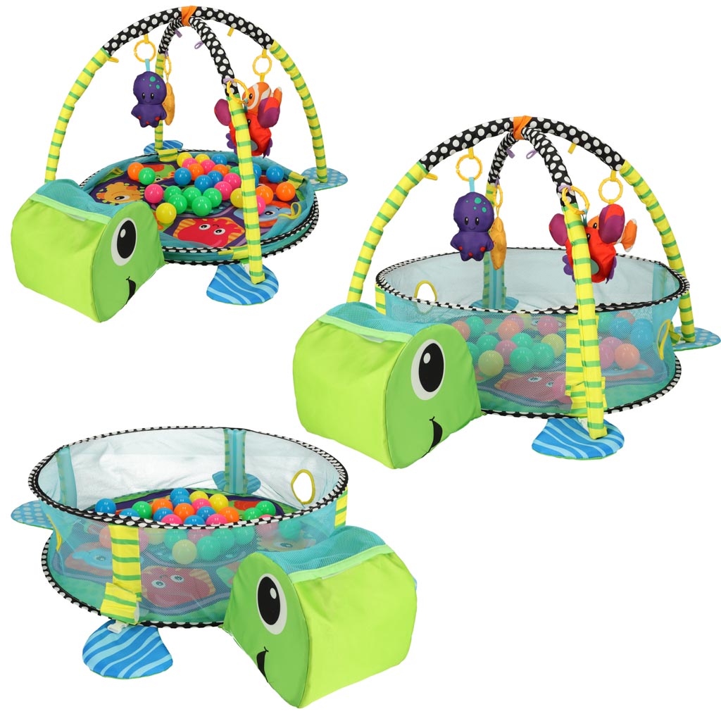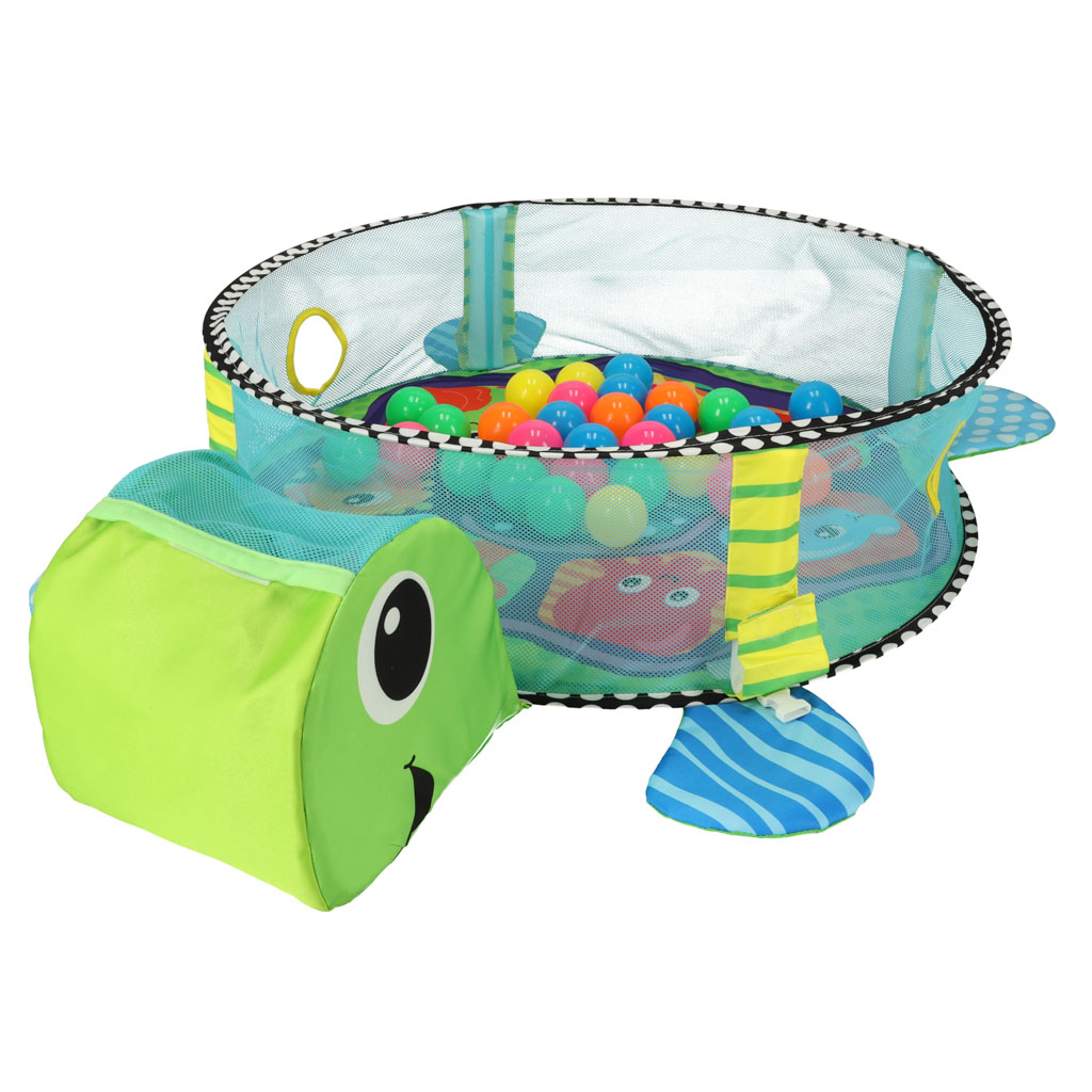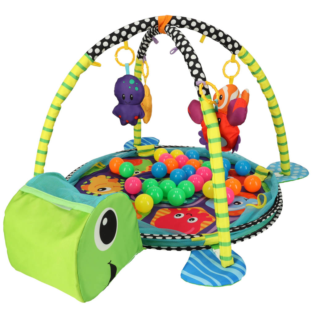 * Komplektiga on kaasas 30 värvilist plastikust palli (5 rohelist, 5 oranži, 5 sinist, 5 kollast, 5 punast ja 5 lillat), mille abil saab luua lapsele põneva pallimere – pallide sees saab ukerdada, harjutada viskamist, püüdmist, veeretamist jpm. Samuti on pallid sobilikud värvide sorteerimiseks. Turvaäärise sees ka augud, kust saab palle läbi panna – väga hea motoorika-harjutus ning pakub lastele alati huvi.