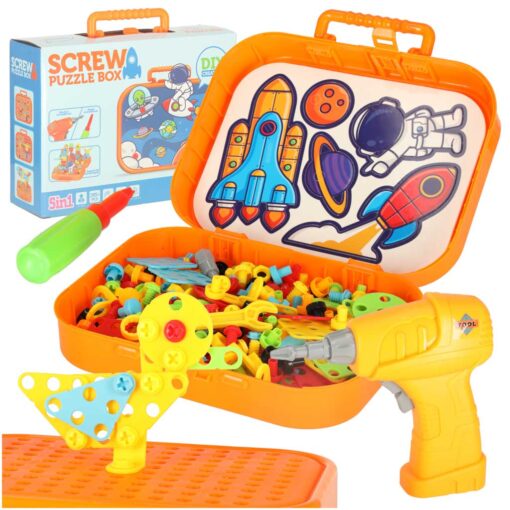 2) Kaasas käsikruvikeeraja, vahetatavate otstega akukruvikeeraja ning 80 erivärvilist plastikust kruvi. Nüüd saab mosaiikpilte teha juba kruvidega. Laps saab proovida kruvisid aukudesse keerata nii käega, tavalise kruvikeerajaga kui ka akukruvikeerajaga. Harjutab täpsust ning erinevate tööriistade ja töövõtete kasutamise oskust. Annab ohutul viisil esmased praktilised oskused kruvimise osas. Kruvikeeraja toimib 2x AA patatreidega (patareid ei kuulu komplekti). Toimib mõlemat pidi – saab keerata kruvisid nii sisse kui välja.