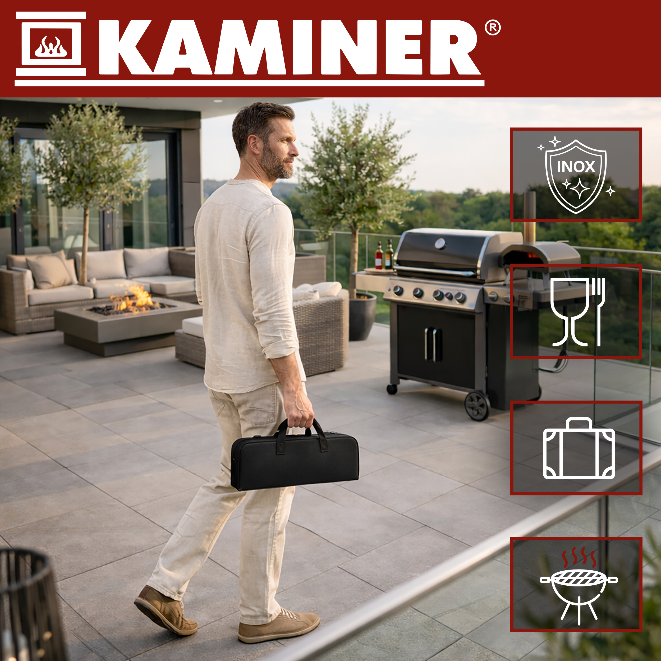 Praktiline grillitarvikute komplekt koondab kõik olulised tööriistad ühte kompaktsesse kohvrisse. Komplekti kuuluvad tangid, grillilabidas, kahvel, nuga, marinaadipintsel ning grillresti puhastushari. Tänu tugevale kandekohvrile on kõik tarvikud alati korras ja käepärast – sobib kasutamiseks aias, terrassil, matkadel või piknikul.