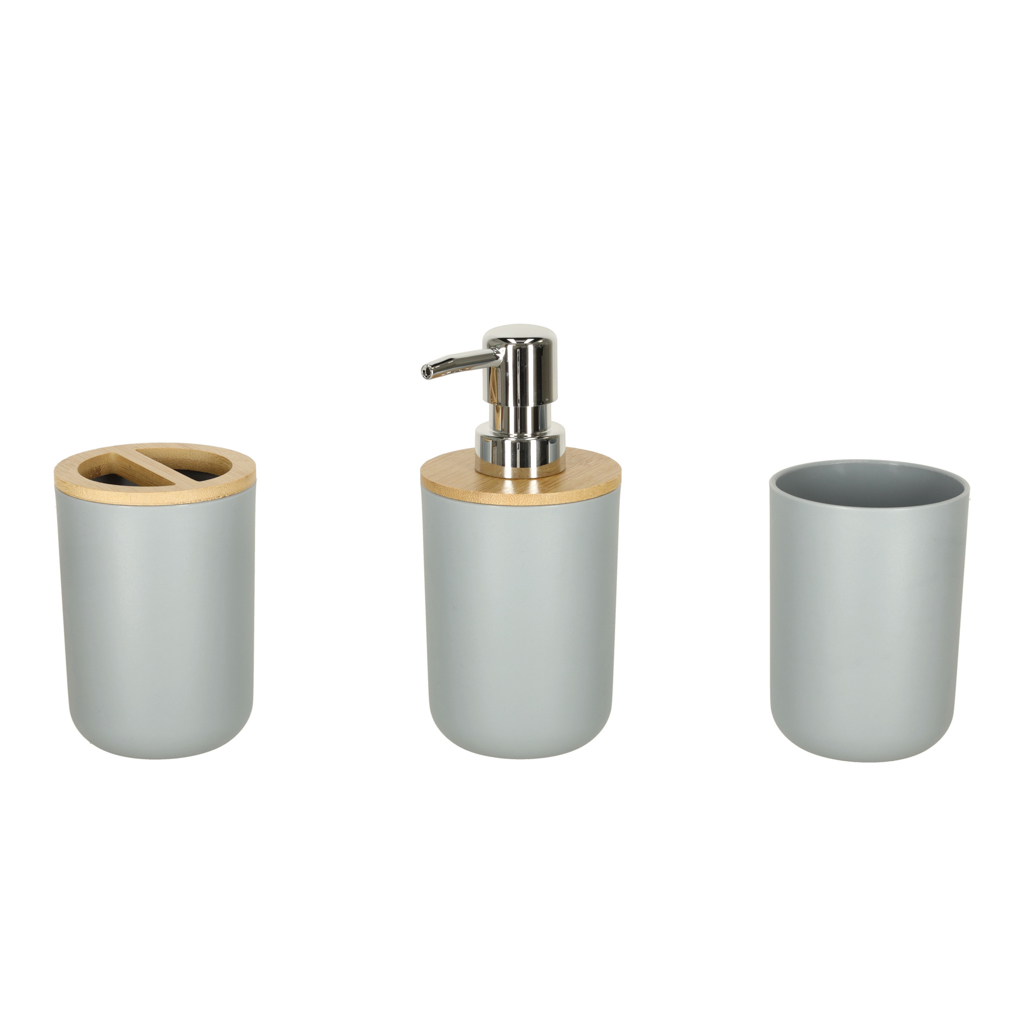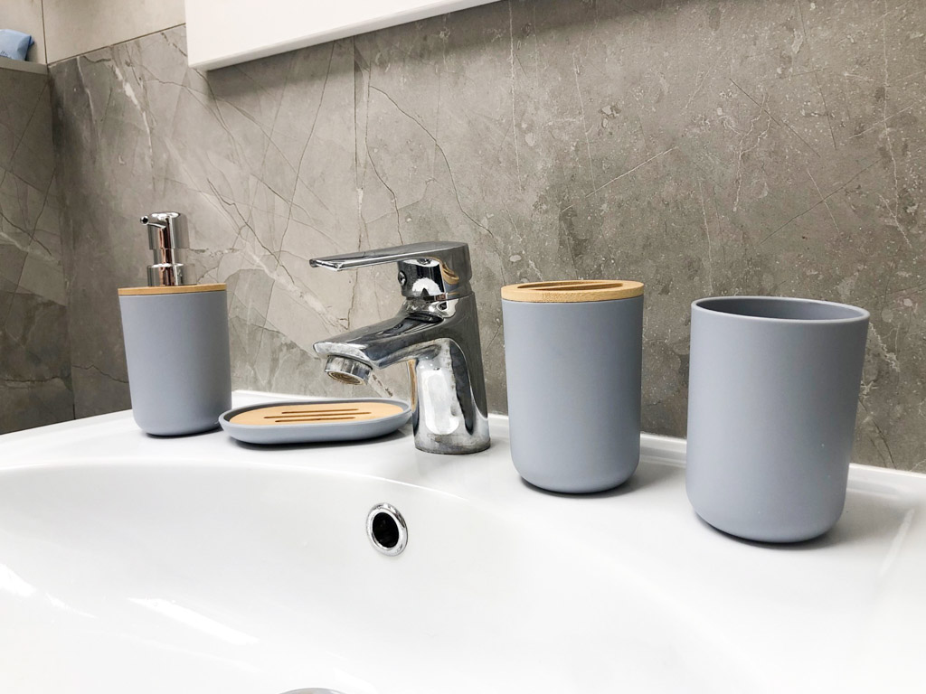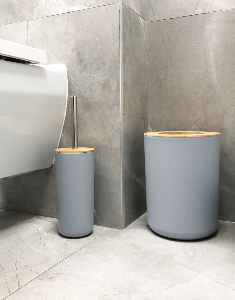 * Komplektis 6 osa – tualetihari koos konteineriga, prügikast, seebi alus, pumbaga seebidosaator, topsik (nt hambaharjade jaoks), tass