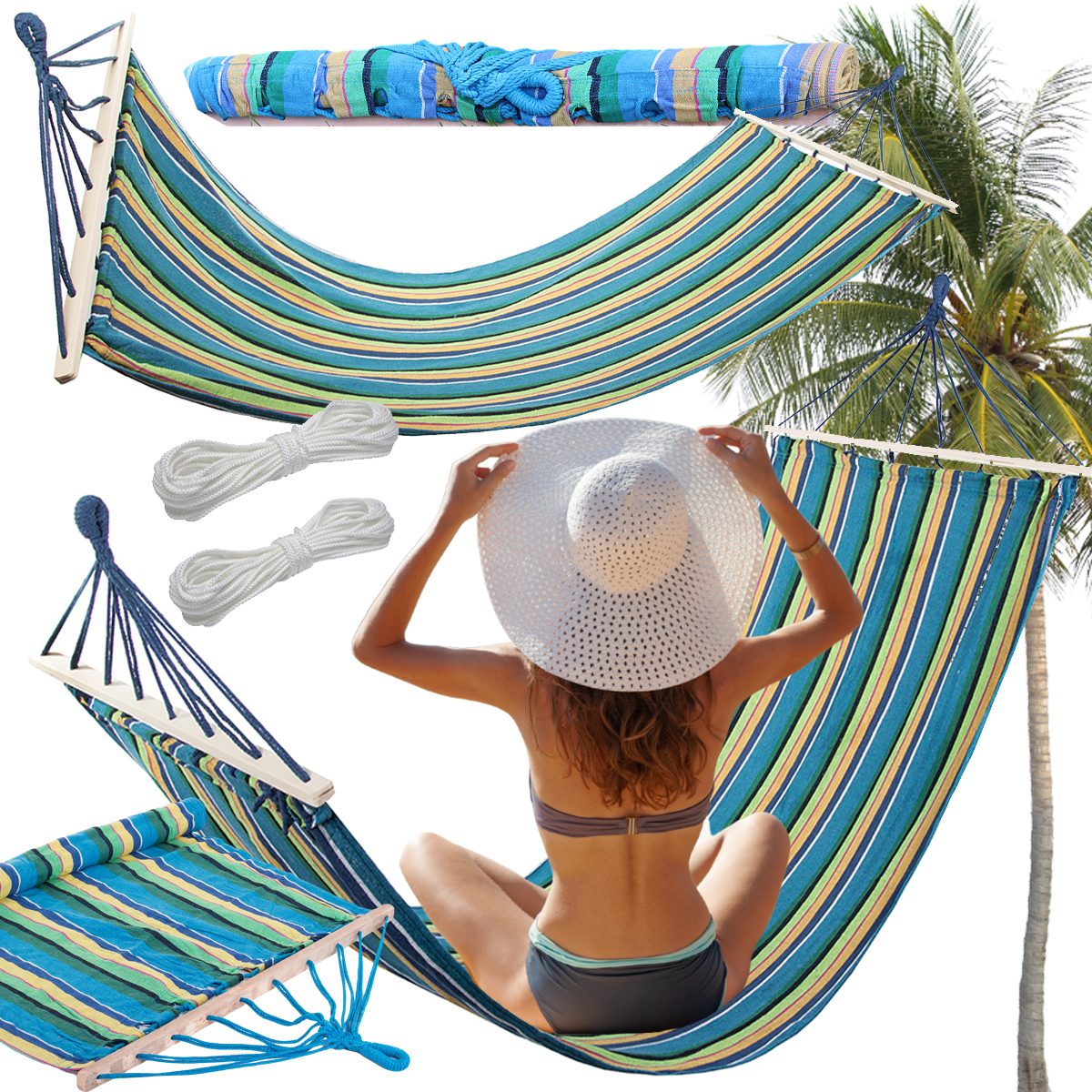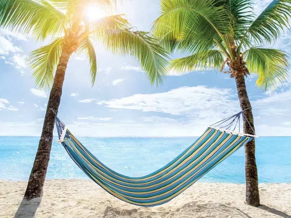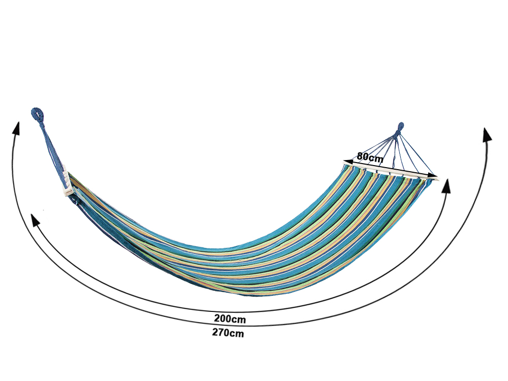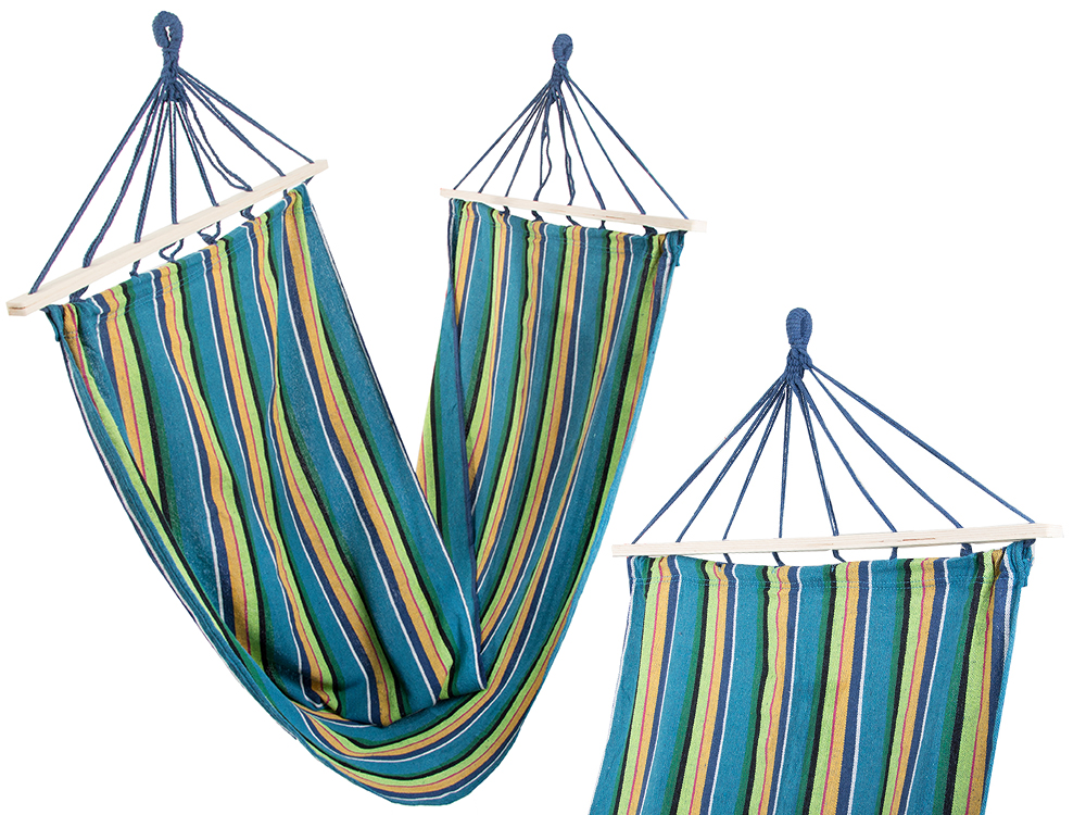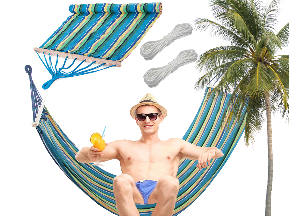 to idealna rzecz dla wszystkich, którzy lubią spędzać wolne chwile na łonie natury. Wystarczy przywiązać dwa końce hamaka do drzew lub wytrzymałych słupków i cieszyć się wygodą. Do zestawu dołączone są dwa sznurki dzięki którym możemy zamocować nasz hamak. Można w nim np. czytać książkę delikatnie się kołysząc w miękkim hamaku.