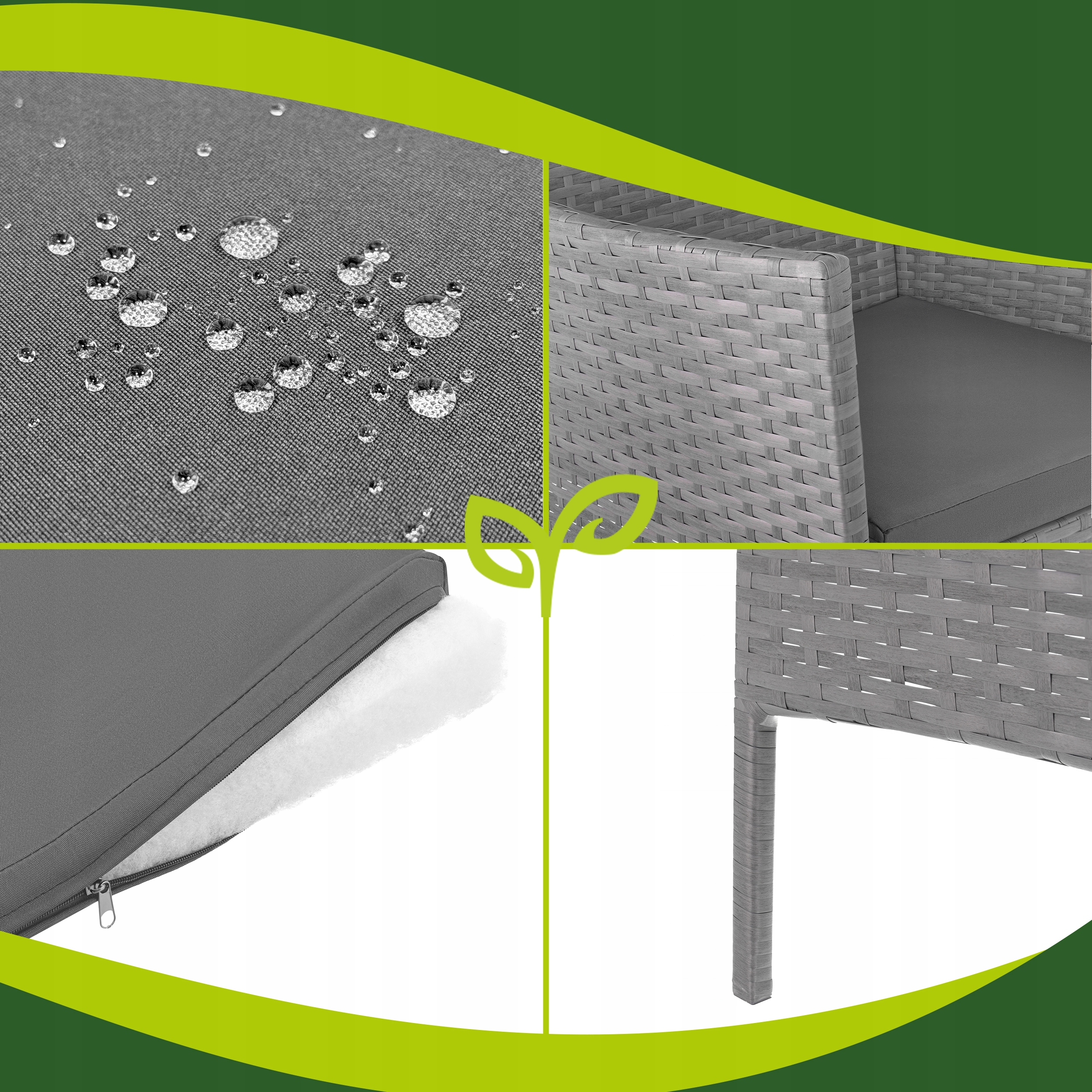 Mööbel on disainitud nii, et see oleks mugav, praktiline ja visuaalselt kaasaegne. Pehmed istmepadjad suurendavad istumismugavust ning universaalne tumehall toon sobib hästi erinevate terrassi- ja aiakujundustega.