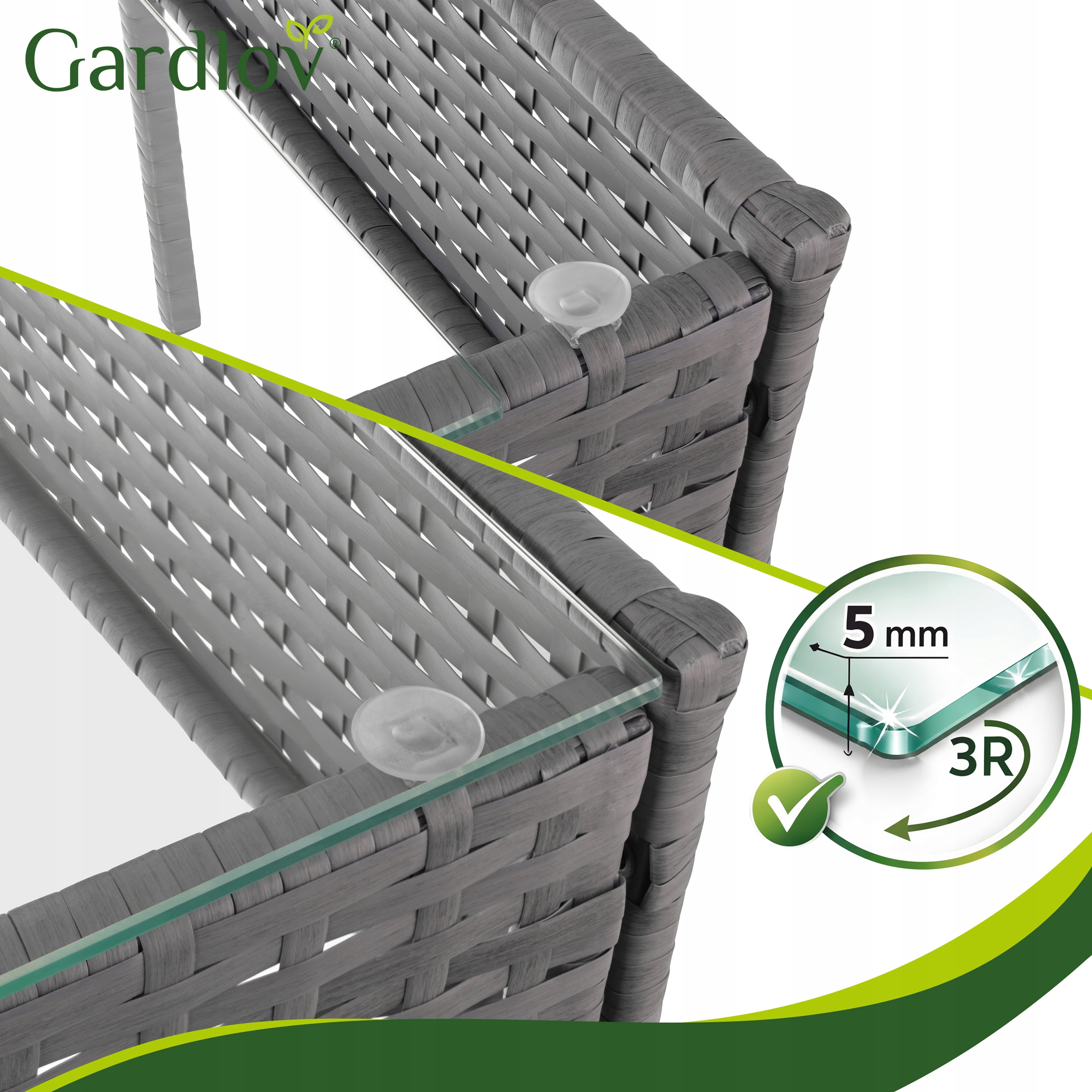 5 mm klaasist lauaplaat annab komplektile kaasaegse välimuse ning pakub praktilist pinda jookide, suupistete või dekoratsioonide jaoks. -