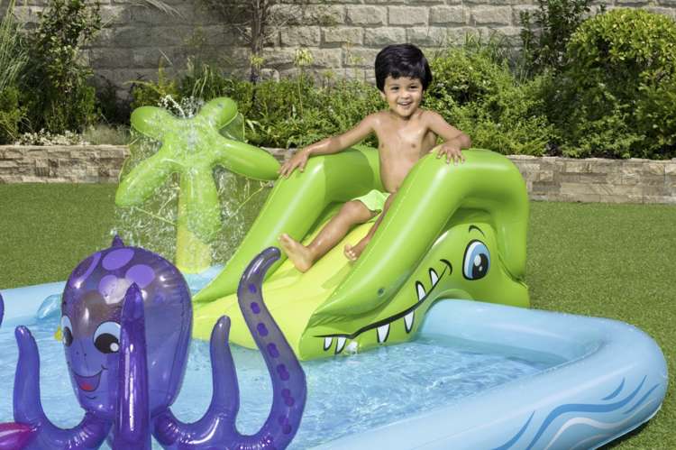 - Eemaldatav täispuhutav liumägi – liumägi lisab tegevust ja vaheldust, võimaldades lapsel turvaliselt libiseda ja veemänge mitmekesisemaks muuta.
