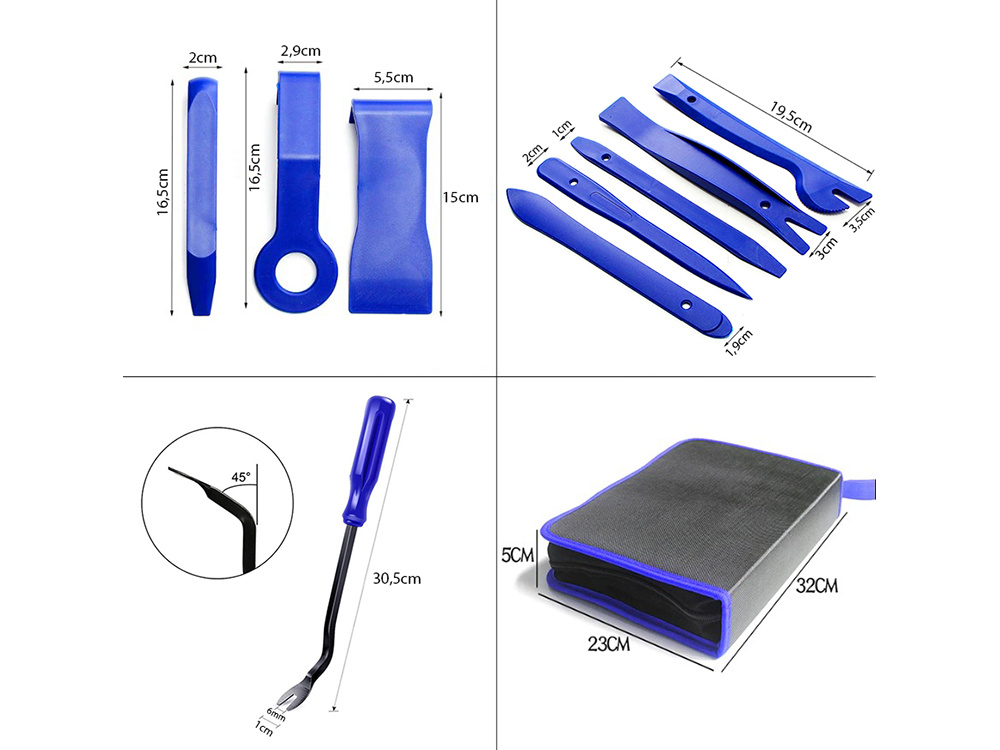- Kvaliteetne materjal: Tööriistad on valmistatud tugevast plastist, mis ei kahjusta auto sisustust.