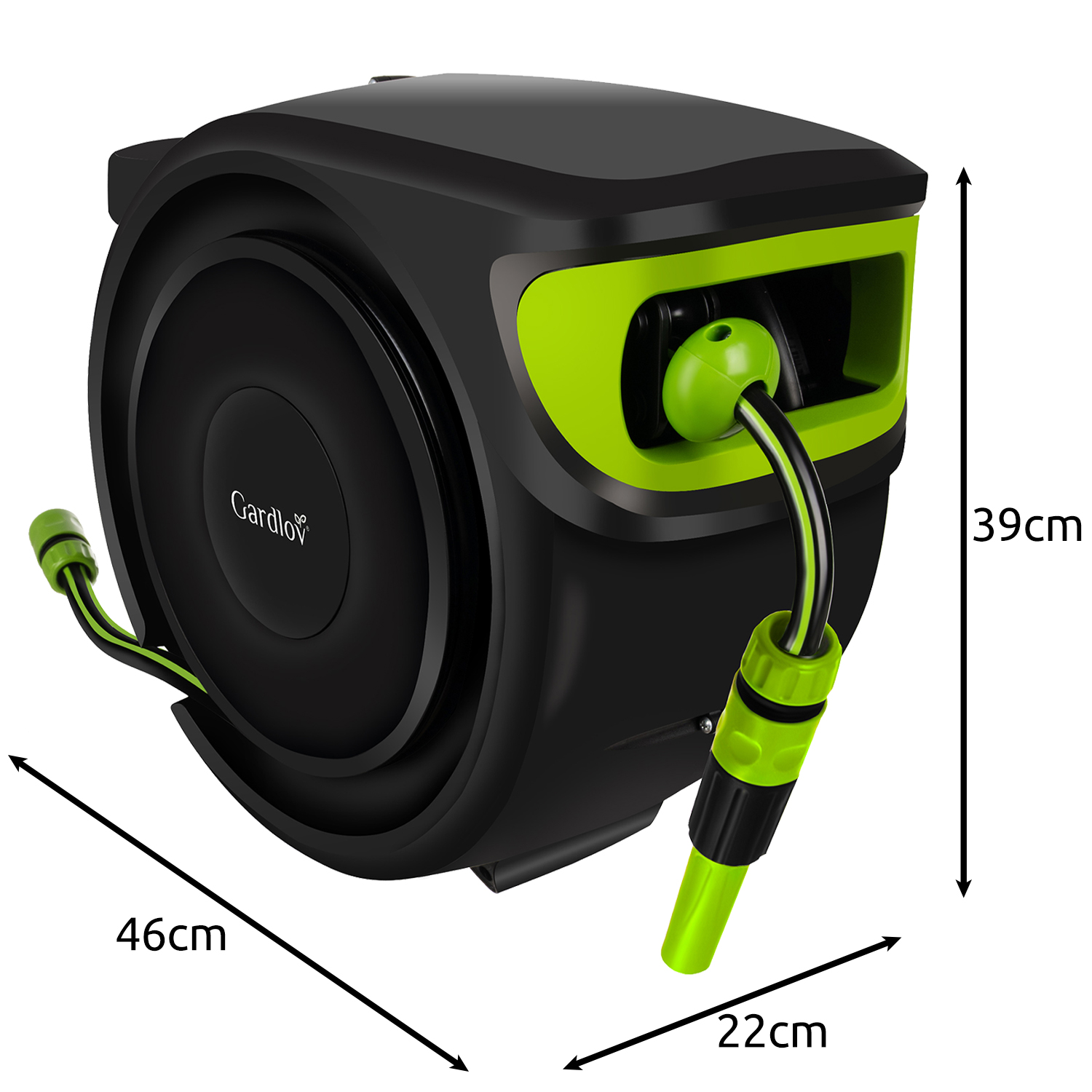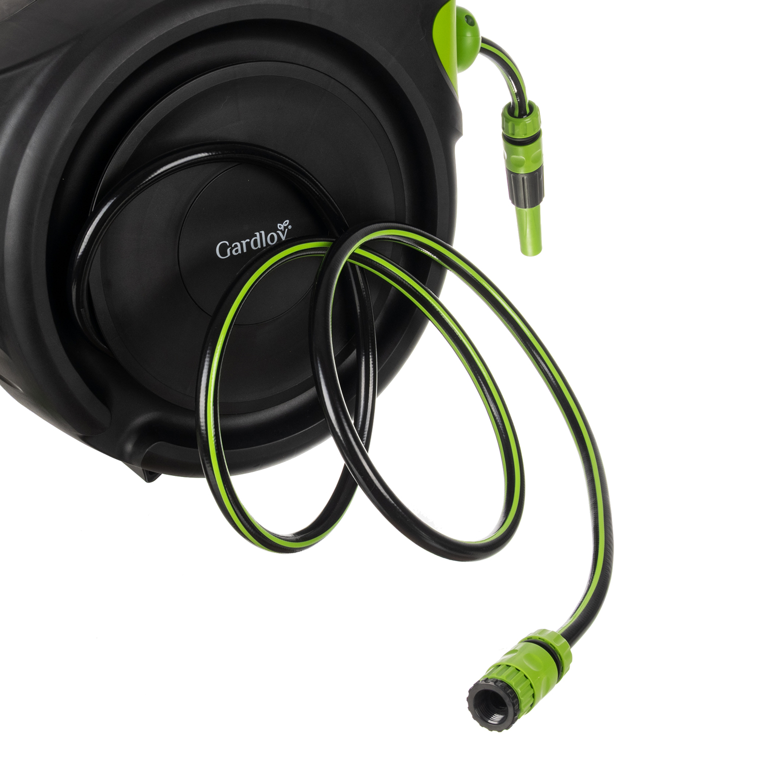 Automaatne vooliku tagasikerimine – voolik kerib end ühtlaselt tagasi rulli ilma käsitsi kerimiseta.