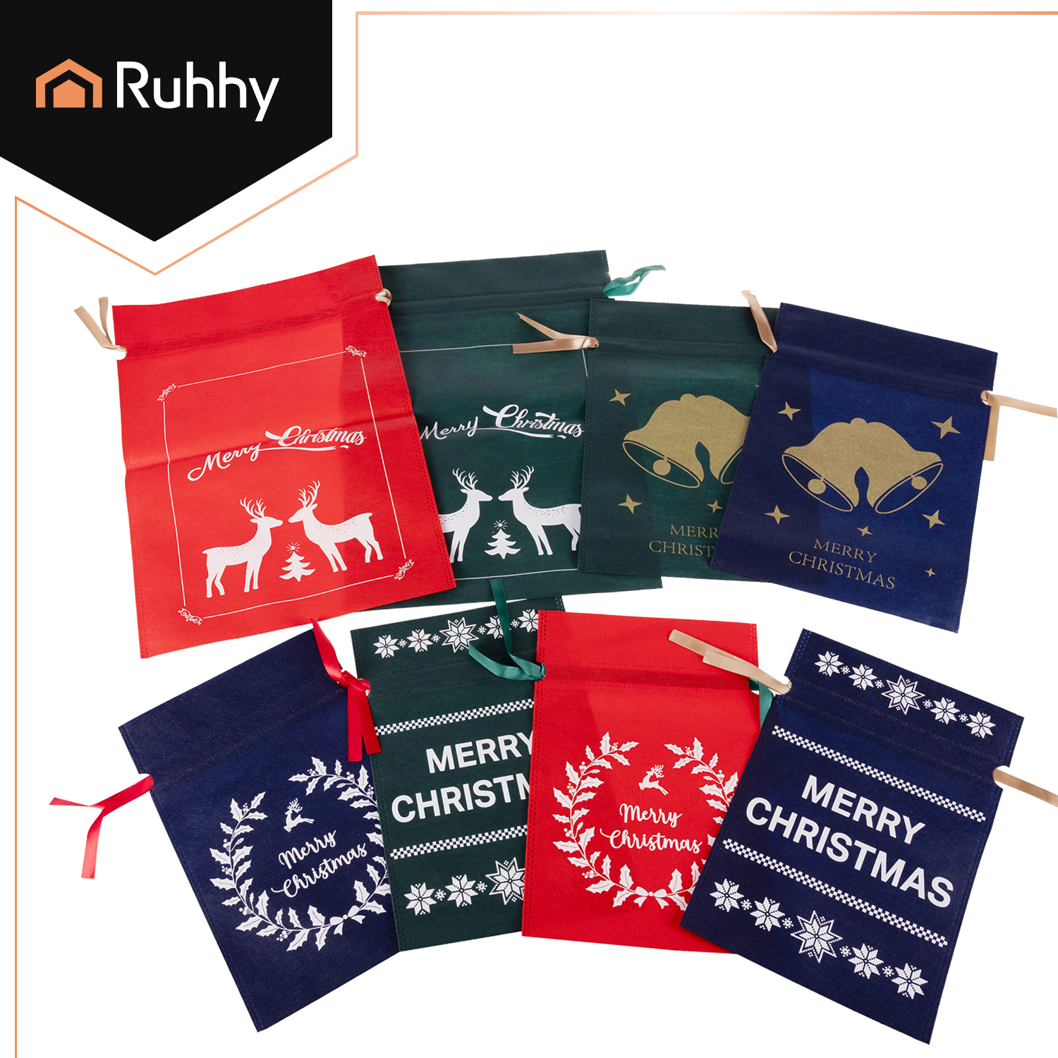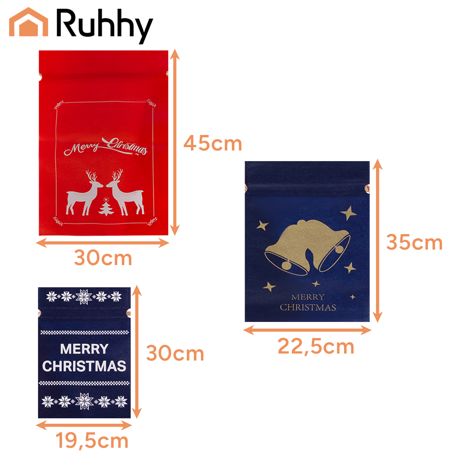 - CHRISTMAS PATTERN – this unique collection of bags will allow you to wrap gifts in a simple and tasteful way without using tape and scissors. The back of the bags is one color, while the front has white or gold prints: reindeer, bells, holly twigs, stars. Each bag also has the inscription "Merry Christmas".