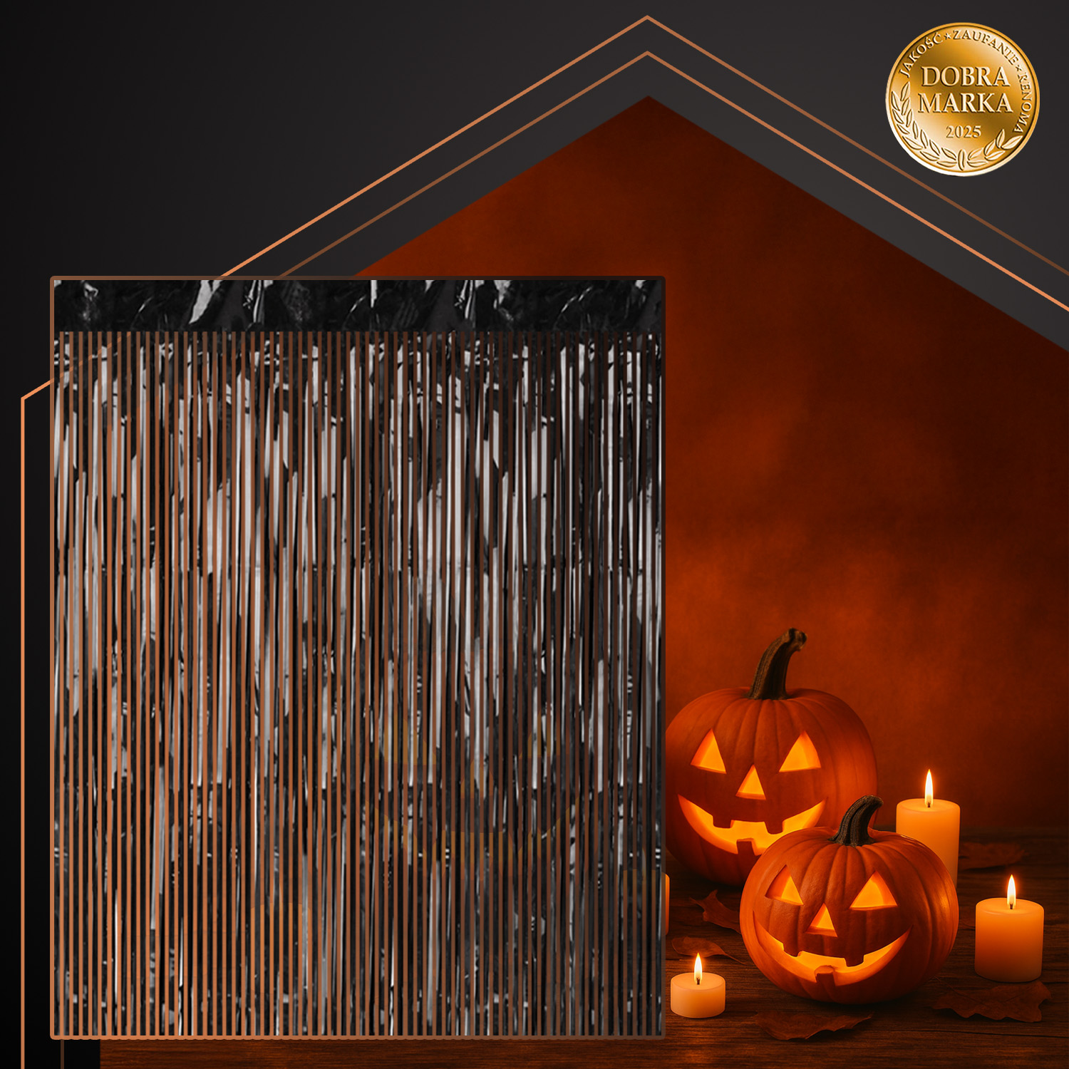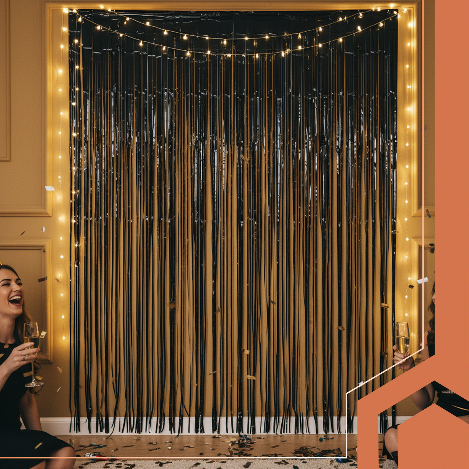 Must metallikläikega dekoratiivkardin on efektne kaunistus pidudele ja üritustele, luues ruumi piduliku ja pilkupüüdva atmosfääri. Läikivad ribad peegeldavad valgust ja liiguvad õhu käes, mis annab dekoratsioonile dünaamilise ja glamuurse välimuse. Kardinat saab kasutada nii fototaustana, sissepääsu kaunistamiseks kui ka seina- või lavadekoratsioonina.