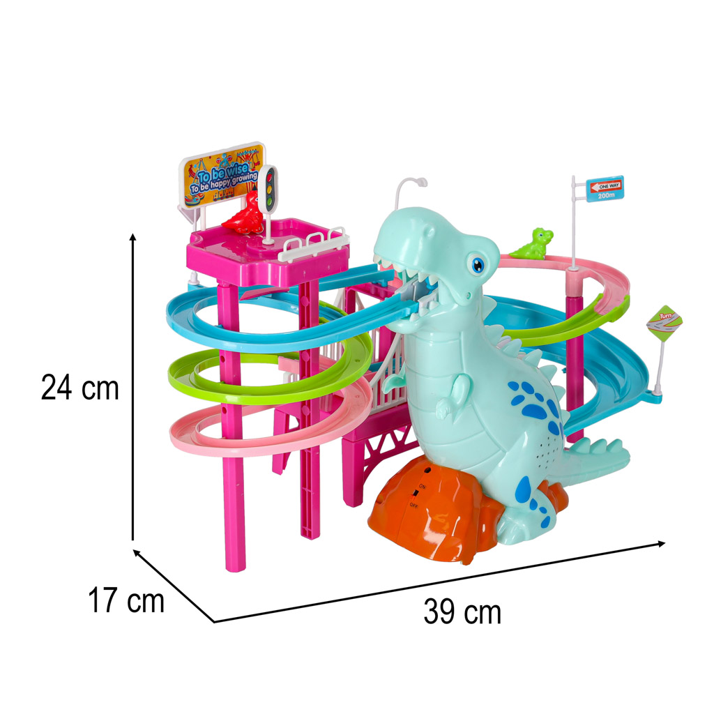 *Väikesed dinosaurused tõusevad elektrilise trepi abil rajale ja kihutavad seejärel mööda põnevat kurvide ja hüpekatega rada suure hooga alla – ikka ja jälle! Sõidusuunda saab reguleerida hoobade abil.
