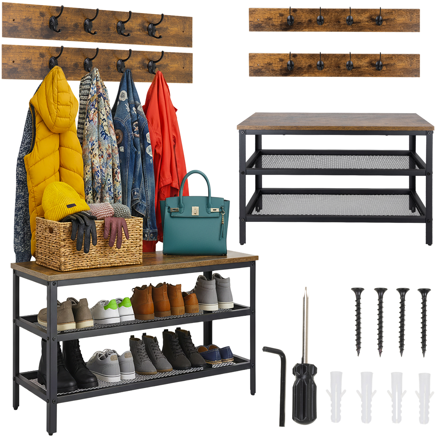 Praktiline 3-ühes lahendus, kus on olemas jalatsiriiul, istumispink ja nagid. Kaks metallist võrguriiulit mahutavad mitu paari jalanõusid ning pruun MDF-ist pealisplaat lisab esikule soojust ja loft-stiili. Pulbervärvitud terasraam tagab stabiilsuse ja vastupidavuse, ning komplektis olevate tarvikutega on kokkupanek kiire ja lihtne.