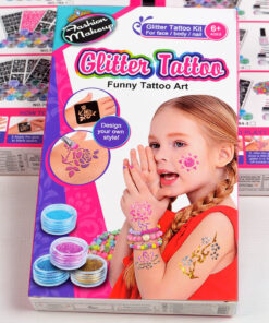 * Glitter-puldbrid on mugavates keeratava kaanega purkides, tattoolehtedel on erineva disaini ja suurusega pilte (sh suured 6x6cm pildid), pintslid on kõik erineva suurusega (väiksemad glitteri täpseks pealekandmiseks, suurem üleliigse pudi mahapühkimiseks, tugevamate harjastega kinnijäänud pulbri eemaldamiseks).