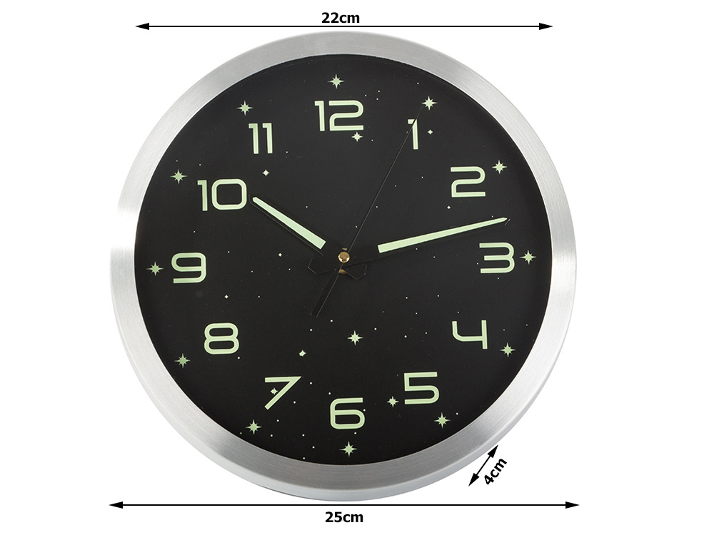 Kauni disainiga seinakell, mis on hästi nähtav ka pimedas! Kell on musta sihverplaadi, hõbedase raami ning fluorestseeruvate numbrite, seierite ja dekoratiivsete tähtedega. Pimedas helendav disain muudab kella lihtsasti loetavaks ka öösel, lisades samas ruumile dekoratiivsust