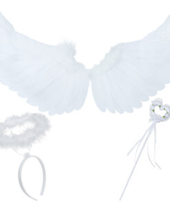 * Komplektis sulgedega kaetud inglitiivad, koheva viimistlusega oreooliga peavõru ja südamekujuline lillekeste ja lintidega kaunistatud võlukepp