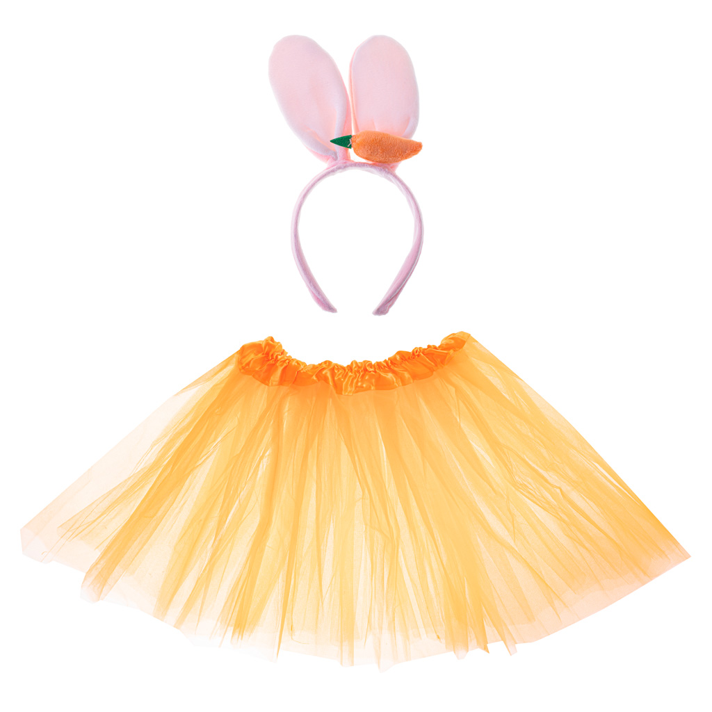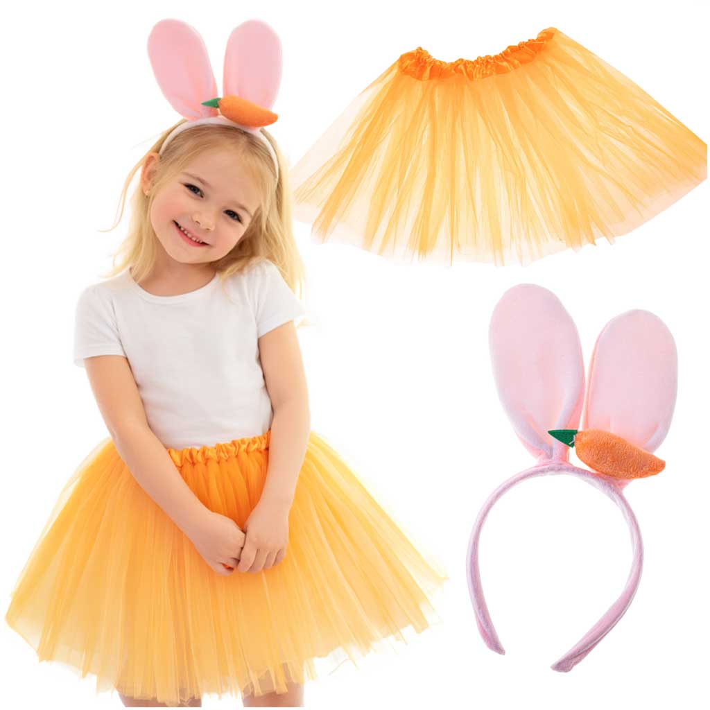 Lõbus jäneseteemaline kostüüm – komplekt sisaldab jänkukõrvade ja porgandiga peavõru ning oranži tüllseelikut, millega saab kiiresti luua armsa jänesekostüümi.