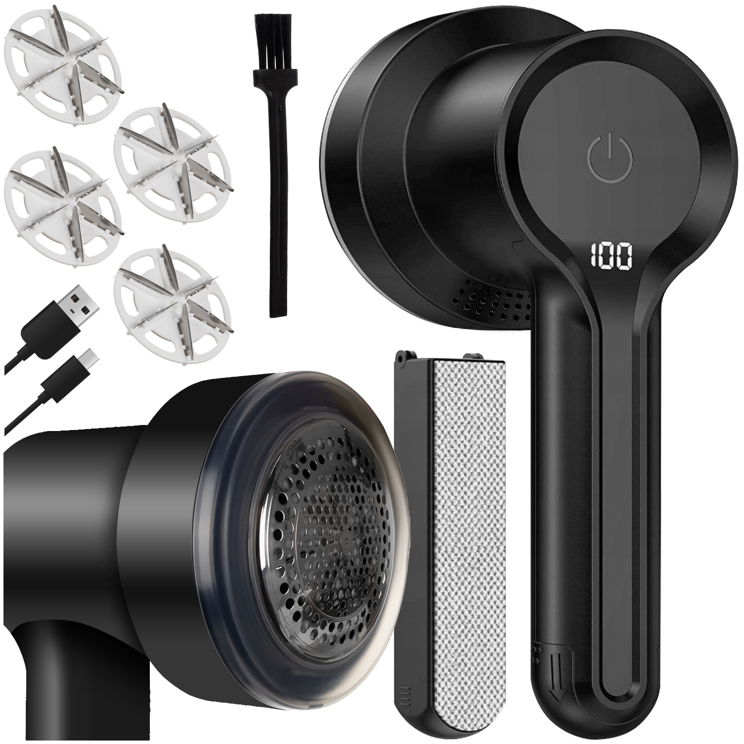Komplektis: riidepuhastaja, elektrostaatiline hari, 4 lõikepead, puhastushari, kogumismahuti, USB‑C laadimiskaabel, kinkekarp.