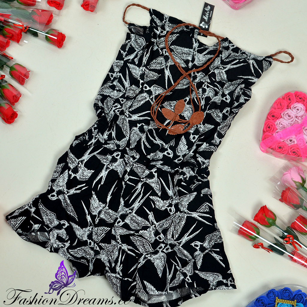 Põnev linnumotiividega muster, õlapaelad ja rinnaosal olev lipsuke kunstnahast
