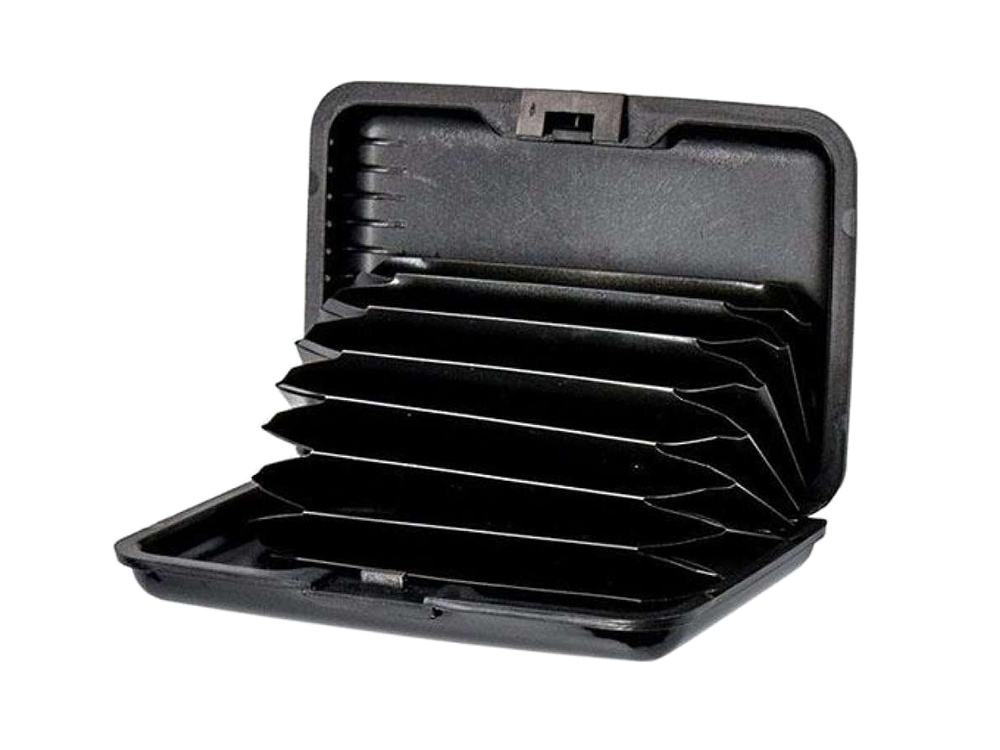 Zewnętrzna część portfela wykonana jest z aluminium, która chroni dane przed czytaniem kard chipowych. Wachlarzowe wnętrze z 6 przegródkami doskonale pasuje na karty i wizytówki, utrzymując również z nimi porządek. Etui posiada również wygodny przycisk ułatwiający zamykanie i otwieranie.