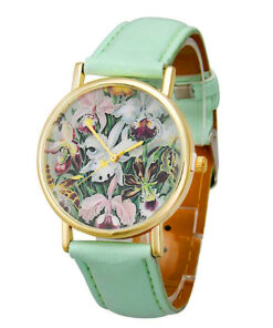 Kaunis lillelise sihverplaadi ja mündirohelise rihmaga käekell