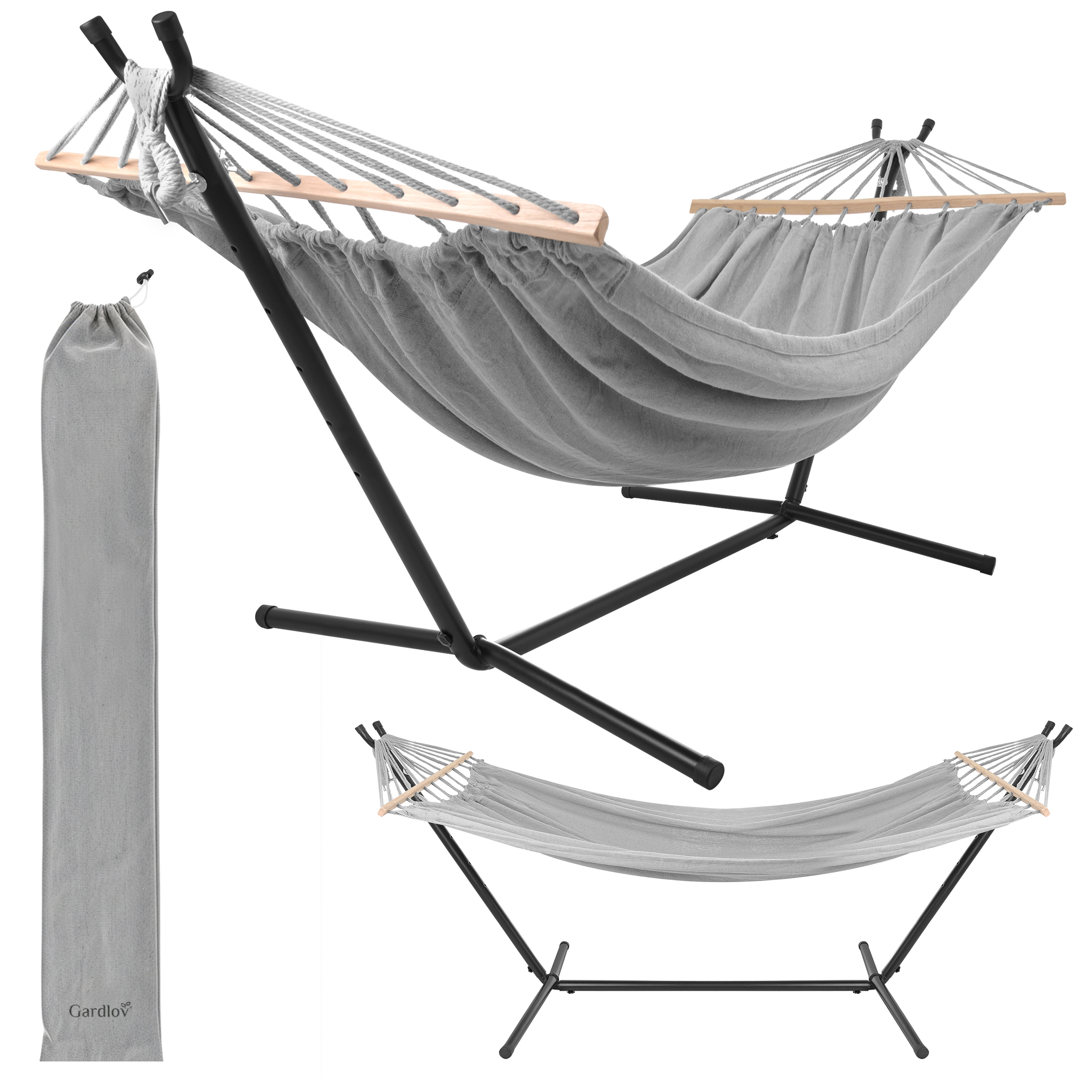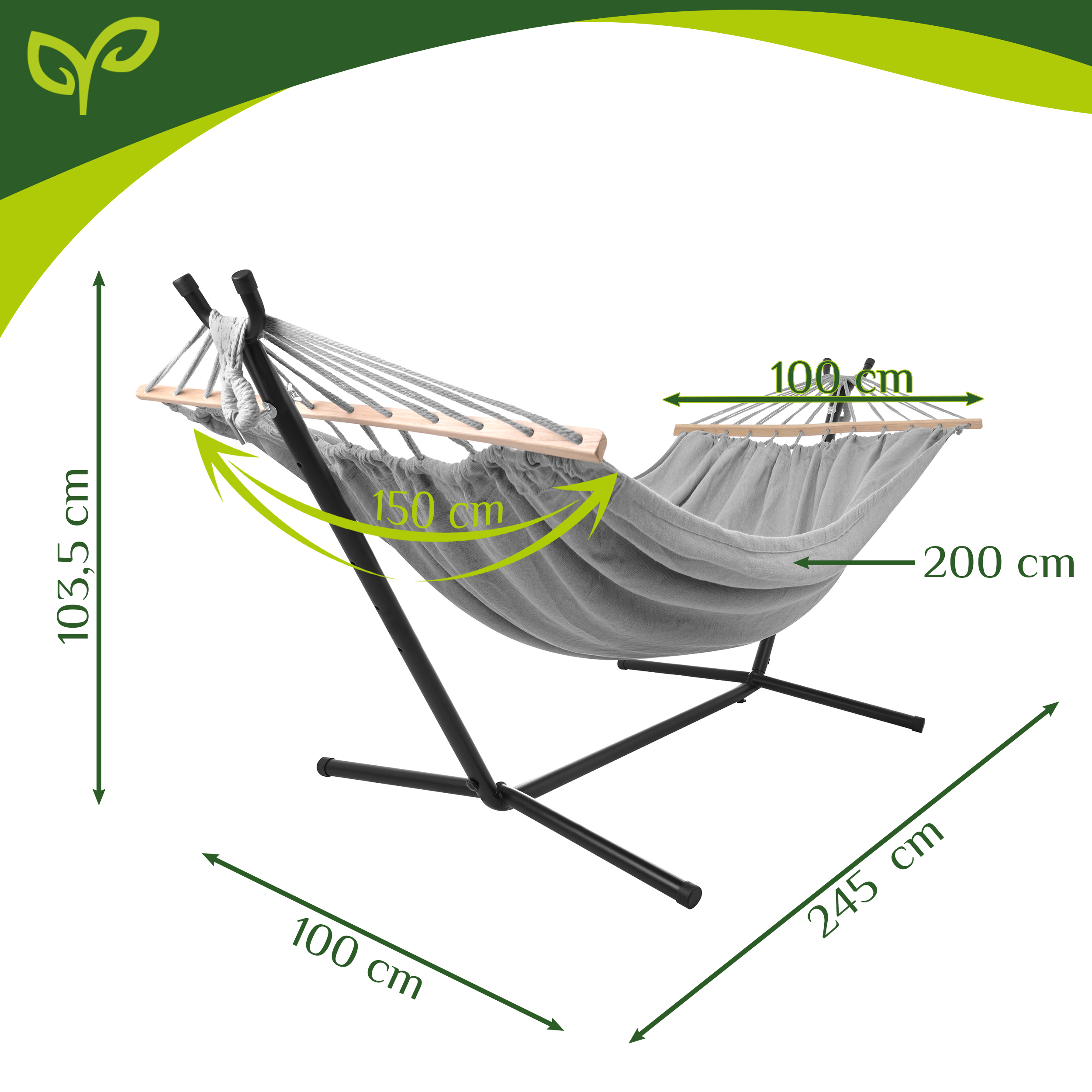 100 cm puidust laotuspulgad – hoiavad võrgu avatuna, et see ei rulluks kokku „kookoniks“, pakkudes rohkem ruumi ja mugavamat asendit.