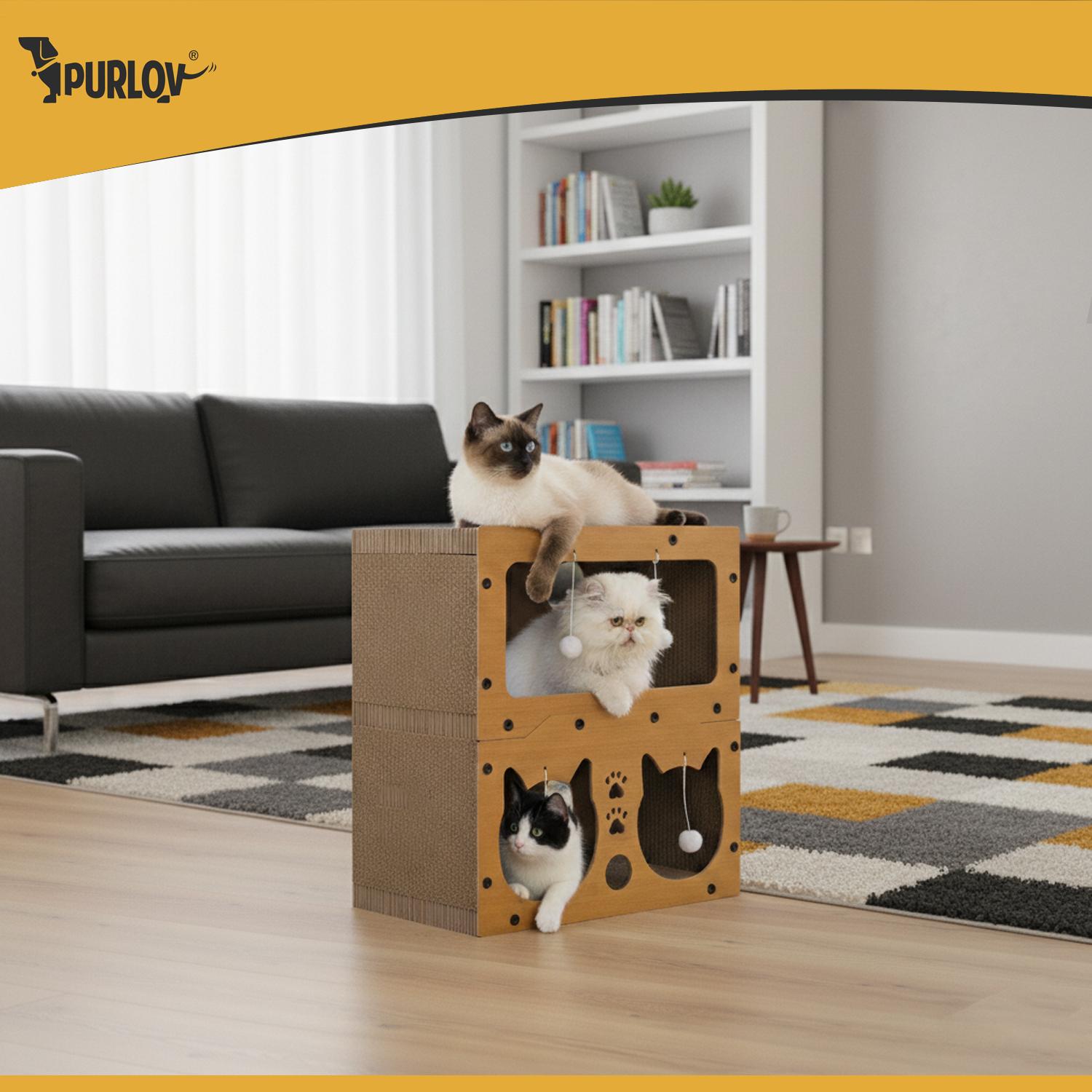 3-in-1 funktsionaalsus – alumine korrus sobib varjuliseks puhkekohaks, ülemine tasand vaatlemiseks ja lebamiseks, külgpinnad toimivad kraapimisalana ning rippuvad pallid kutsuvad mängima. Üks toode täidab mitu vajadust.