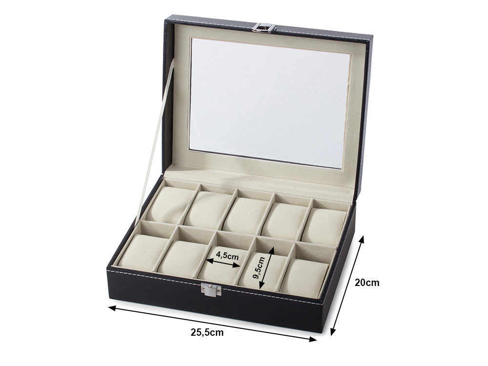 Hoia oma kellad ja ehted korras ning kaitstuna stiilses hoiukarbis, mis mahutab kuni 10 kella. Pehme sisemus aitab vältida kriimustusi ja hoiab aksessuaarid kindlalt paigal. Läbipaistev kaas võimaldab sisu kiiresti üle vaadata ilma karpi avamata.