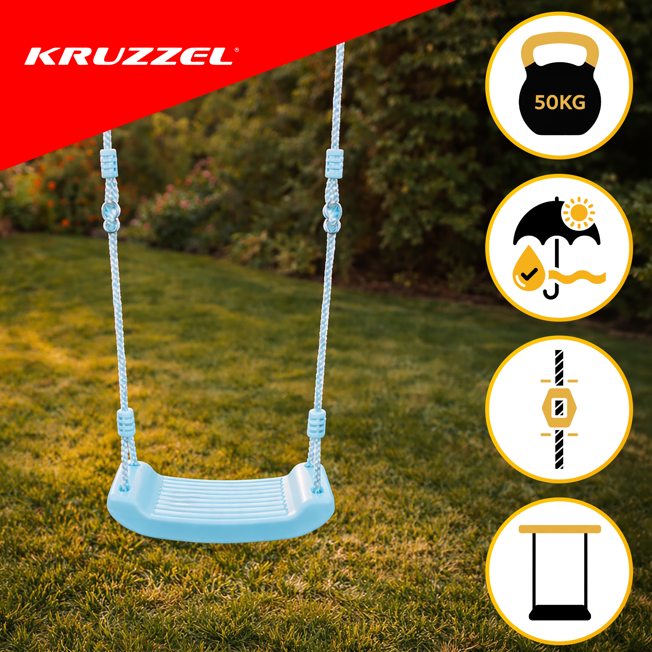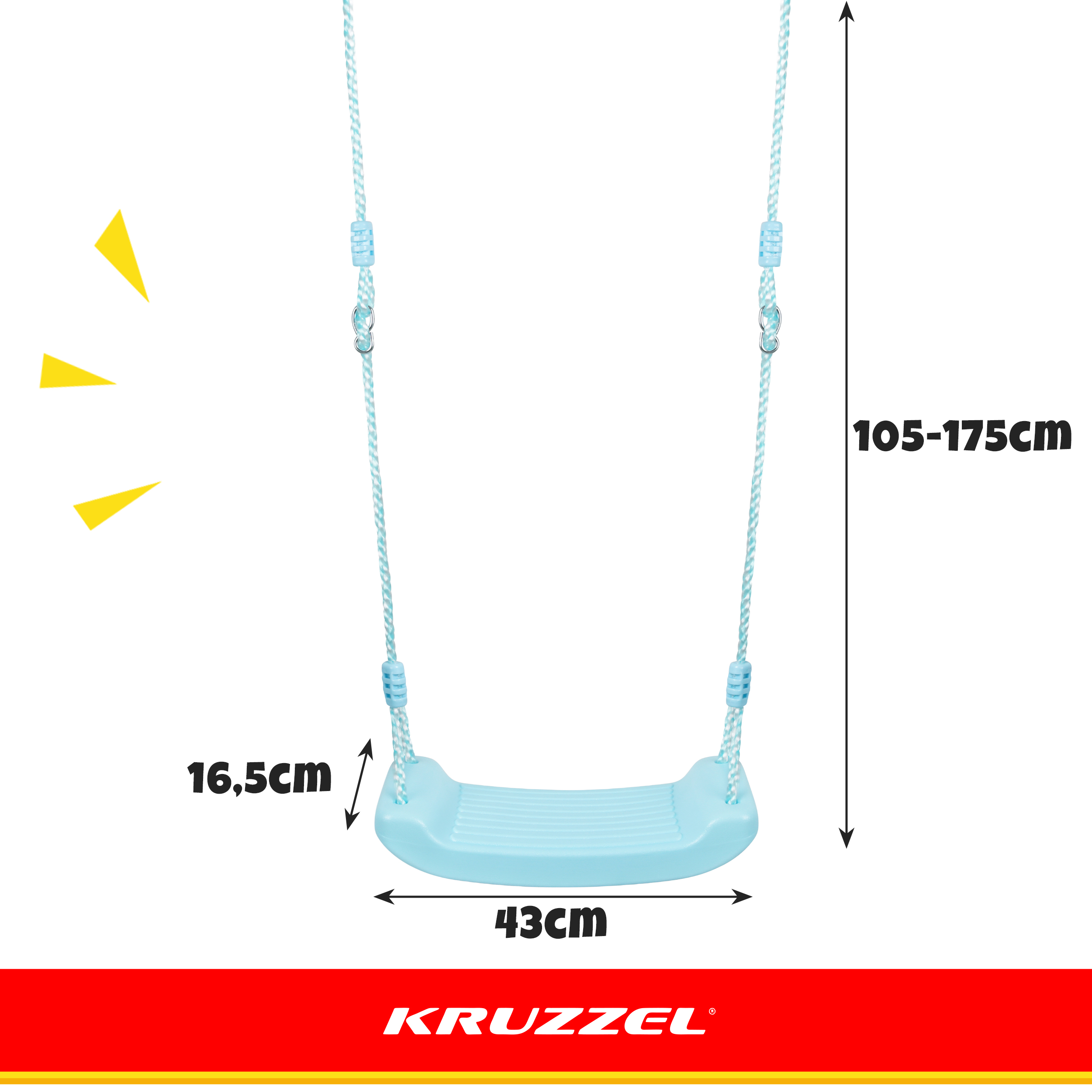 * Tugevad nöörid, korralikud metallist kinnitused ning vastupidavast mittetoksilisest plastikust iste tagavad turvalisuse. Toode on läbinud vastavad testid Euroopa akrediteeritud laboris ning vastab kõigile EU standarditele.