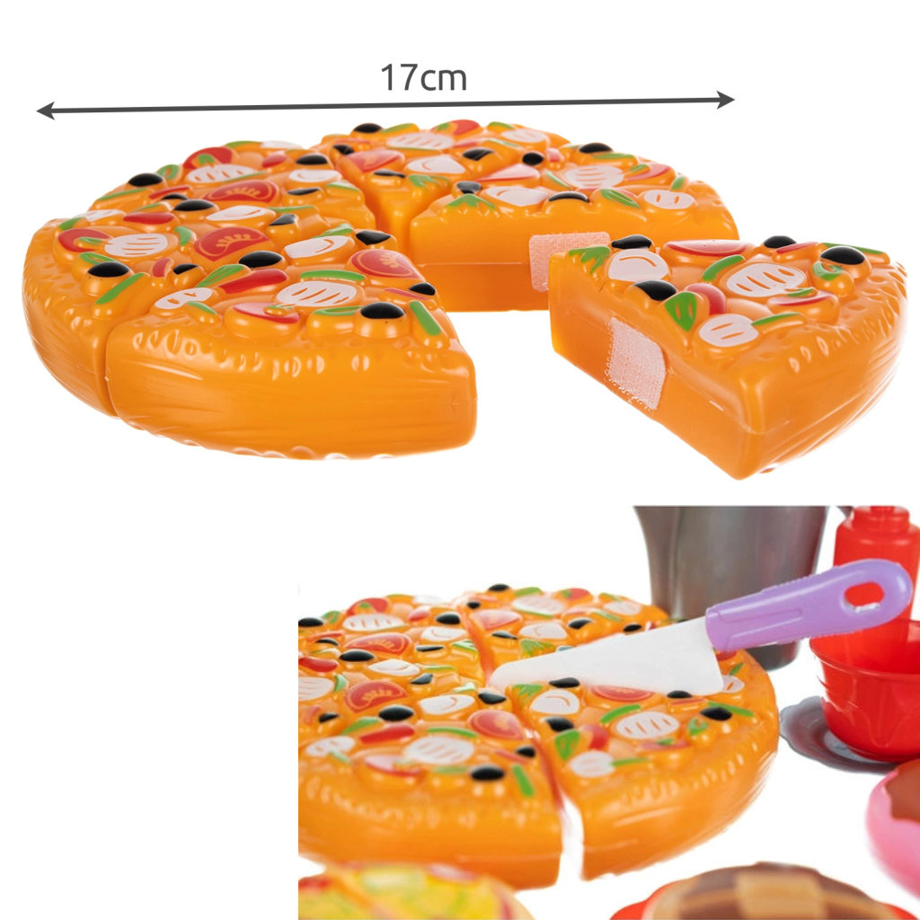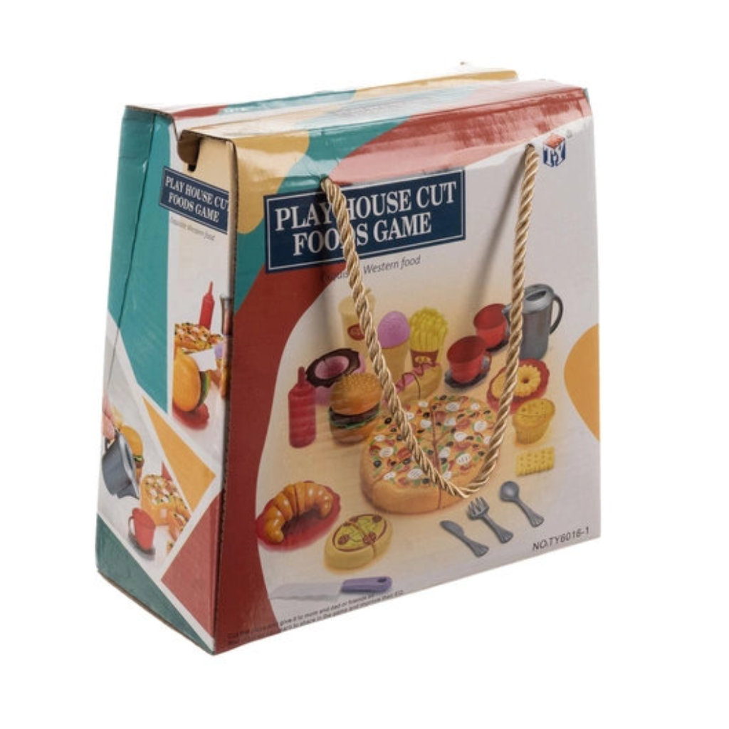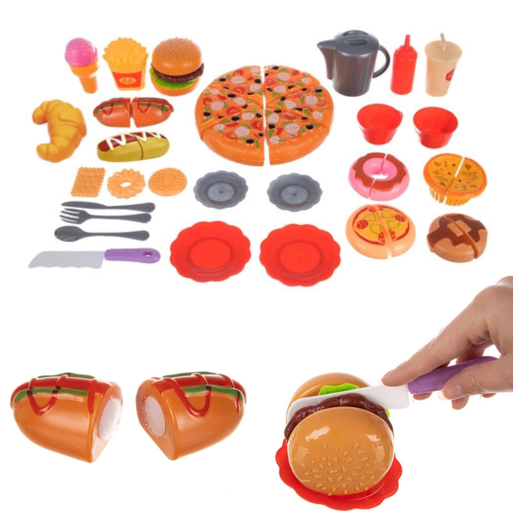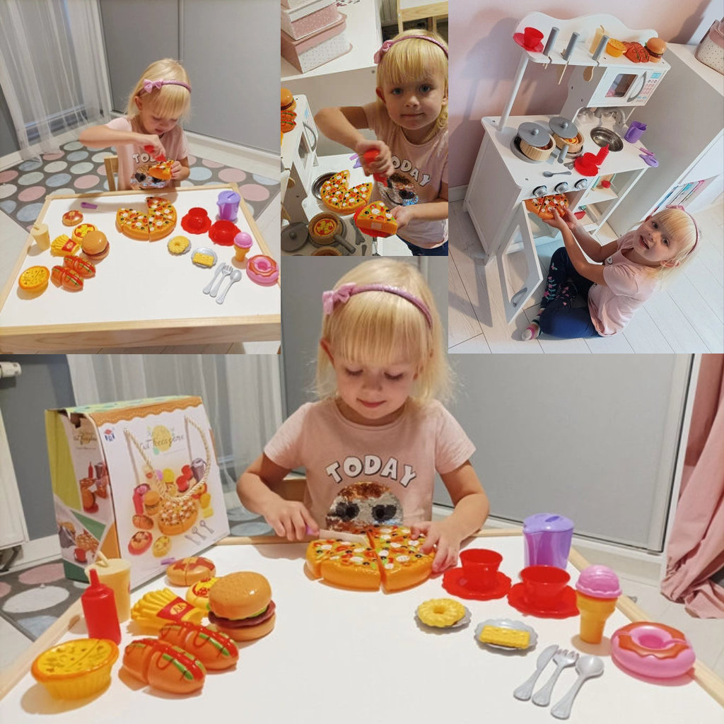 * Komplektis 42 osa: erinevad toiduained (pitsa, burger, hot-dogid, saiakesed, pirukad, sõõrik, muffin, küpsised, friikartulid, jäätis, cola, ketšup jm ) ning mõned nõud, veekann ja söögiriistad