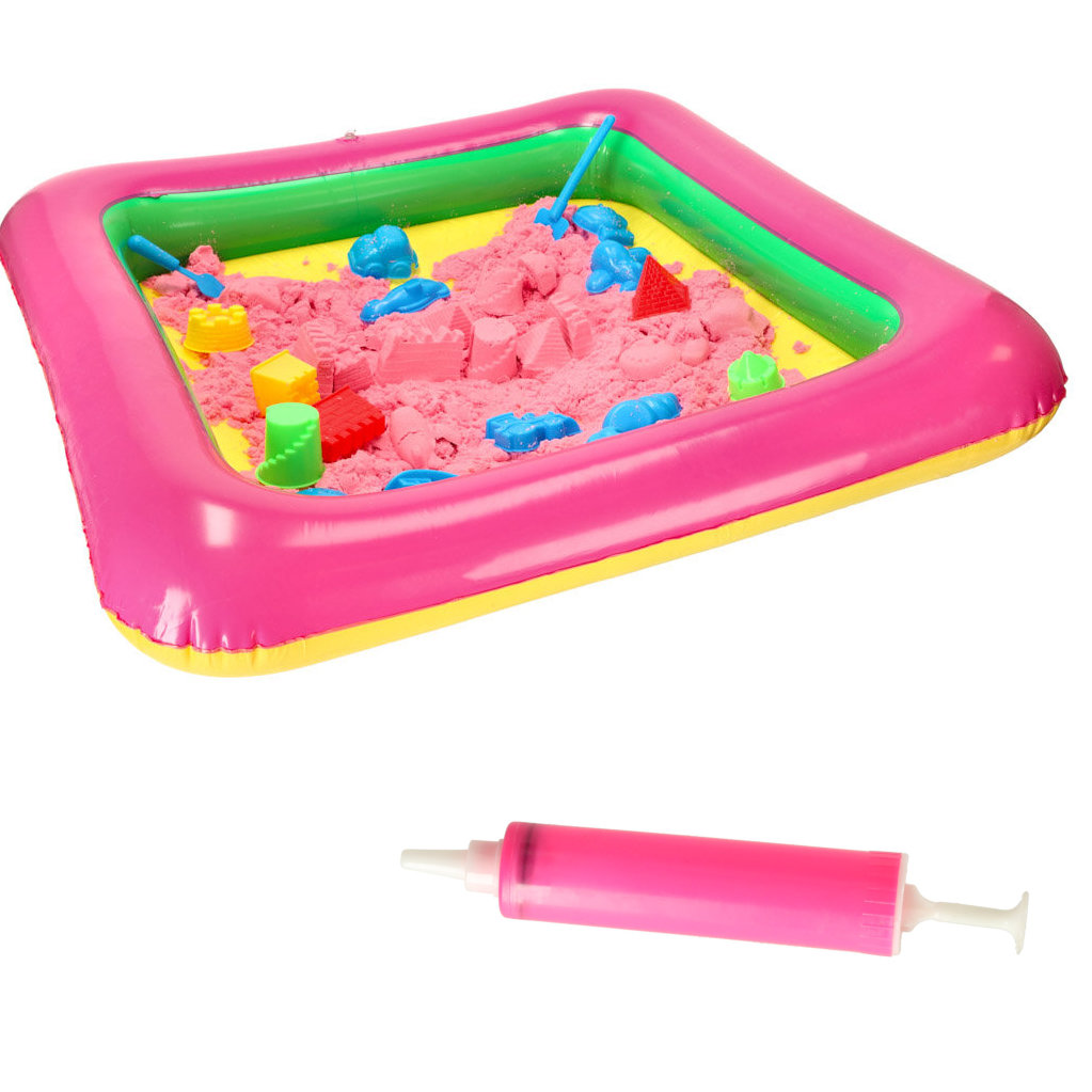 * Kaasas mugav täispuhutavate servadega liivakast. Kaasas on ka pump, mille abil on lihtne seda õhuga täita. Kõrgete äärtega alusel mängudes on kindel, et liiv ilusti koos püsib ja mänguhoos üle lauaserva maha ei pudene ning erinevalt kõvade servadega kandikust või kastist ei ole ohtu, et laps ennast selle vastu ära lööks. Kui alust parasjagu vaja pole saab selle õhust tühjaks lasta ning see võtab väga vähe ruumi. Liivakasti suurus 56 x 40 cm