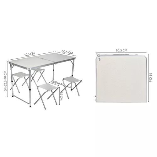 Praktiline kokkupandav matkalauakomplekt, mis sisaldab lauda ja 4 tooli – ideaalne piknikule, telkimisele, aeda või terrassile. Reguleeritava kõrgusega laud sobib mugavalt nii täiskasvanutele kui ka lastele. Kompaktseks kohvriks kokkupandav disain teeb transportimise ja hoiustamise eriti lihtsaks.