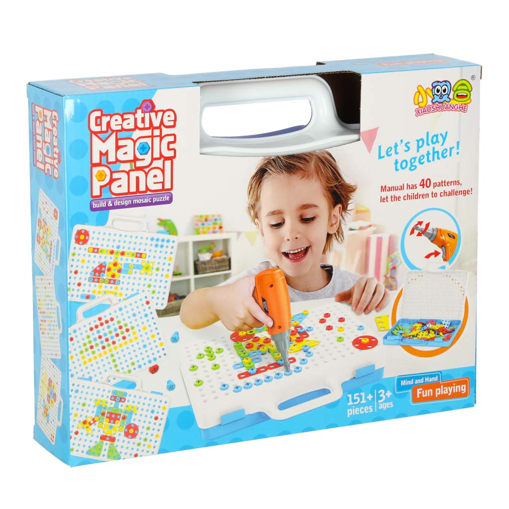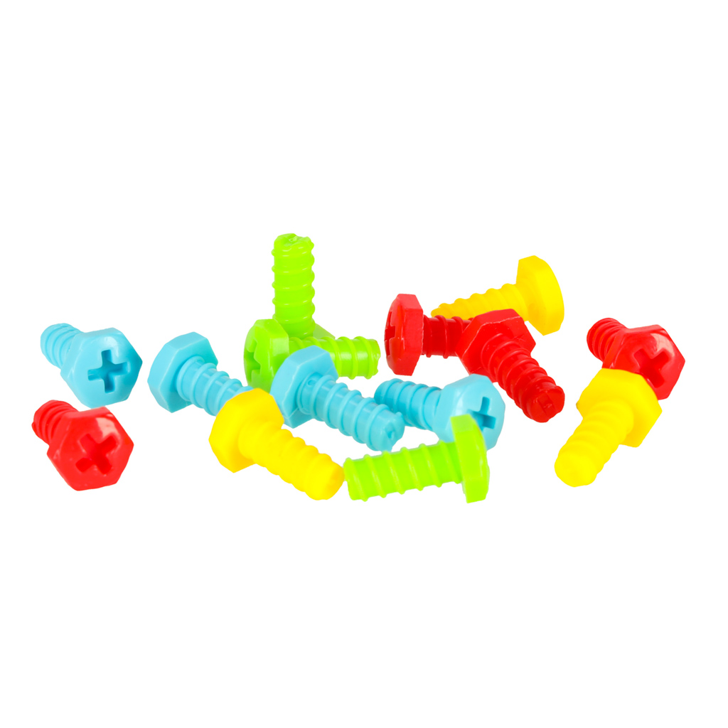 - Värvilised erikujulised elemendid: Erinevat värvi erikujulised elemendidning kinnituskruvid ja poldid stimuleerivad loovat mõtlemist ja pakuvad lõputult kombineerimisvõimalusi. Valmis pildi saab uuesti lahti kruvida (trell töötab mõlemat pidi, sellega saab ka kruvisid välja keerata) ning jälle uusi teha.