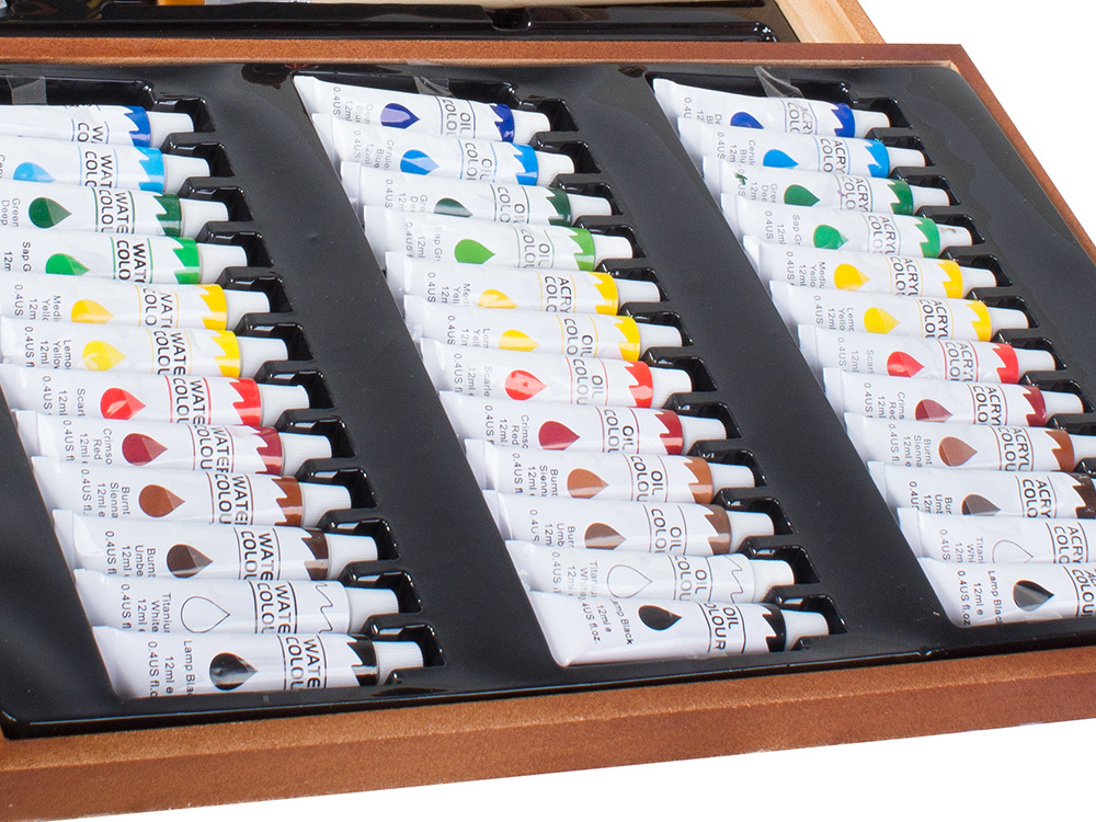 - Kogu vajaliku varustus: Komplekti kuulub 174 elementi, sealhulgas pastellid, värvipliiatsid, akvarellvärvid, teritaja, käsn, paletid, pintslid, pliiatsid ja kustutuskummid.