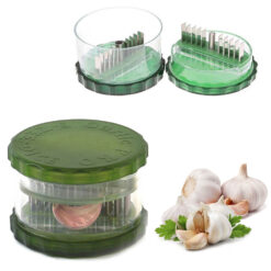 Rozdrabniacz składa się z dwóch części, w każdej z nich znajduje się po 10 ostrzy, które rozdrobnią czosnek na żądaną teksturę. Wystarczy włożyć do środka obrane ząbki czosnku lub inny produkt spożywczy, kilka razy przekręcić w przeciwną stronę i gotowe.