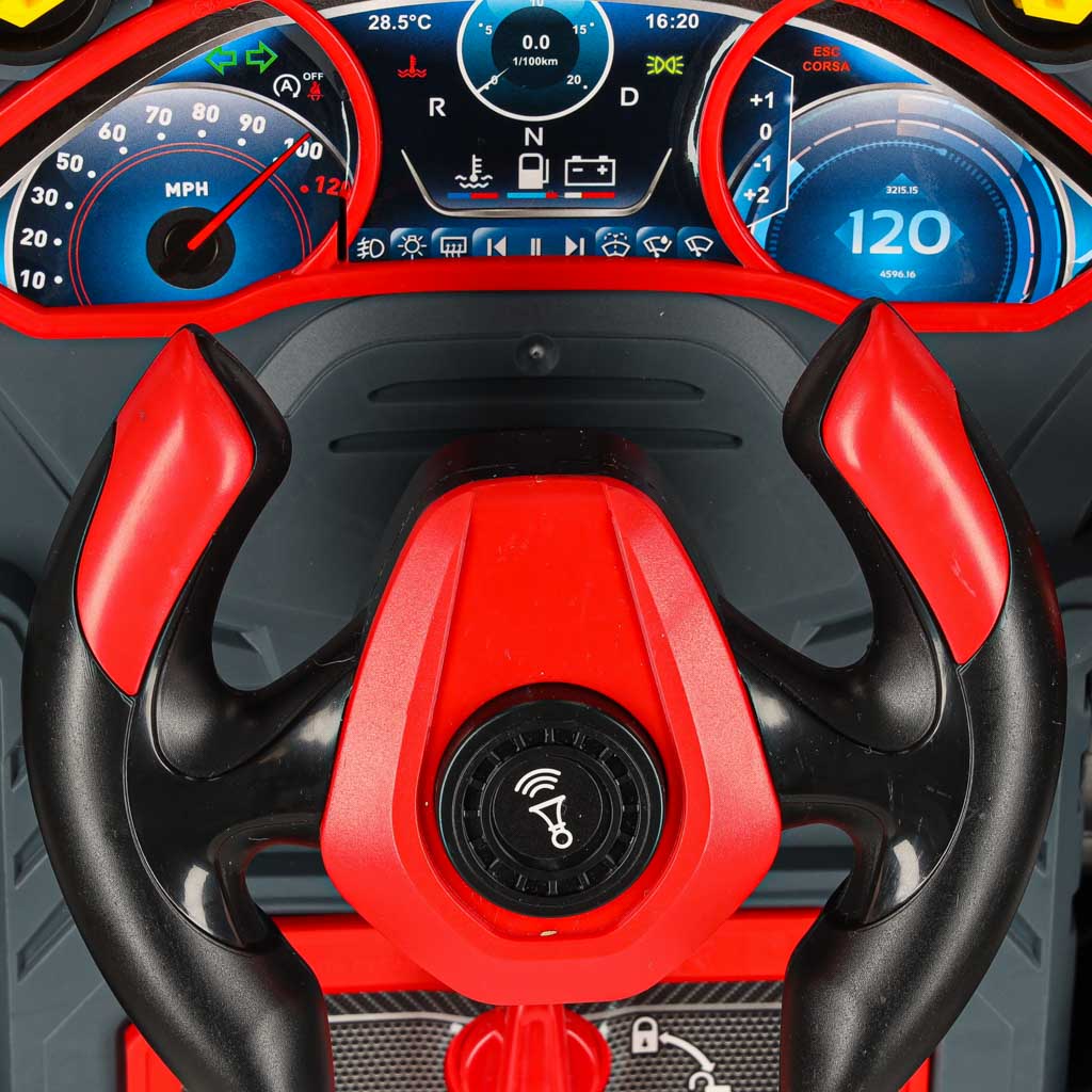 - Interaktiivsed funktsioonid – käivitusnupp, avariinupp, käiguvahetushoob ja pööratav rool toetavad rollimängu ning annavad päris auto tunde.