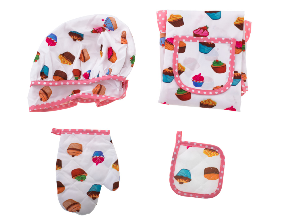 - Mõõdud: Põll (45,5cm x 54cm), kindad (9cm x 16cm), kuumakindel alus (11cm), kokamüts (10cm x 15cm), lusikas (14,5cm), taignarull (20cm), pakend (21cm x 24,5cm x 2,5cm)