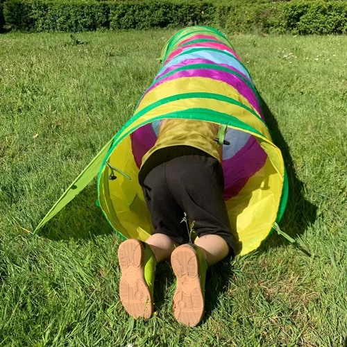 Aseta tunnel siseruumides tasasele ja stabiilsele pinnale. Võta see kotist välja, vabasta kinnitused ning lase konstruktsioonil avaneda. Lapsed saavad tunnelis roomata, mängida peitust või luua oma seiklusraja.