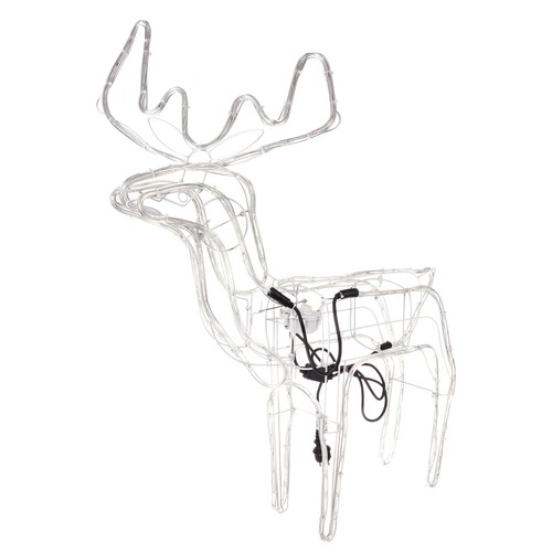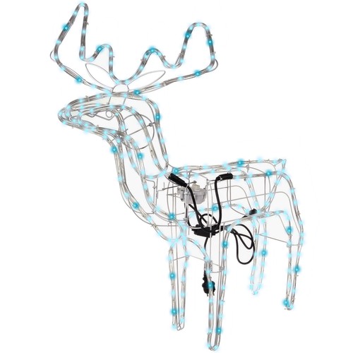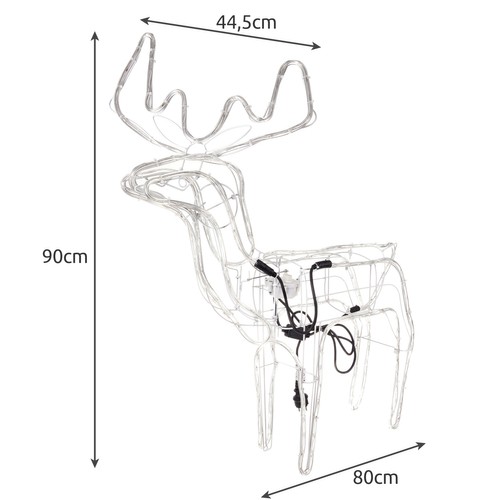 - SPECIFICATION – steady light color: cold white; flash color: blue; for use: indoor / outdoor; power: 12 W; IP44; power cable length: 1.3 m; number of diodes: 216 to pcs; reindeer length: 80 cm; antler width: 44.5 cm; maximum height of reindeer: 90 cm; weight: 2.450 kg; weight in packaging 3.123 kg.