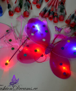 * Kaunistatud säravate lillekestega, võlukepil küljes lehvivad lindid, peavõru sulgede ja liblika kujudega