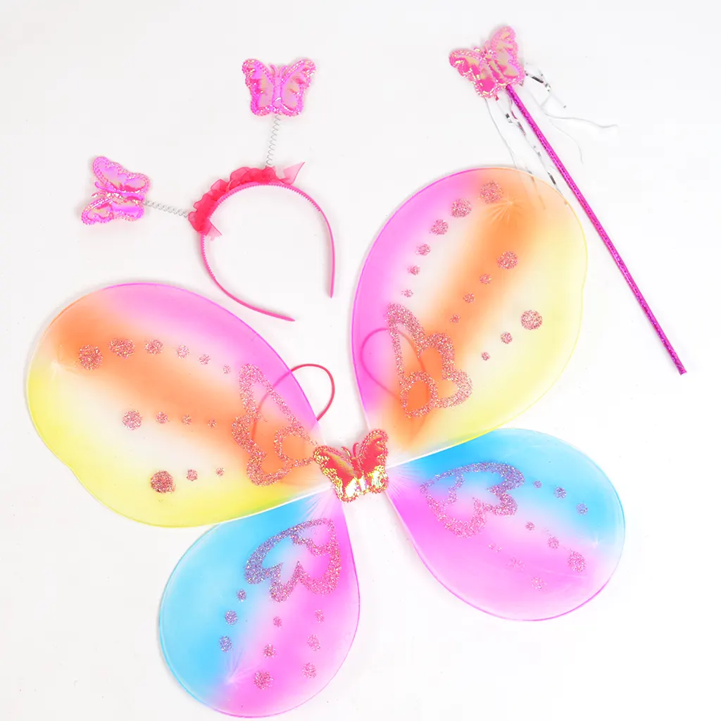 * Tiivad kinnituvad kummiga õlgade ümber. Sobivad nii lastele kui täiskasvanutele. Ääred traadiga, saab ise sobivasse asendisse painutada. Tiibadel kaunite värvidega läbikumav materjal, peal sädelev muster. Suurus 50x38cm
