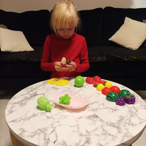 * Erinevad puuviljad ja aedviljad, mida laps saab noaga pooleks lõigata