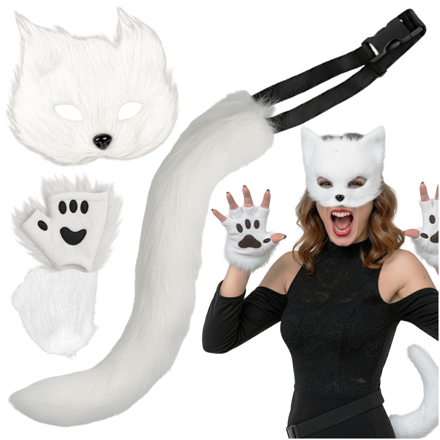 Täielik 4in1 komplekt – komplektis on mask, saba ja käpikud, mis loovad koos ainulaadse loomaliku välimuse. Sobib kassiks või ka polaarrebaseks kehastumiseks,