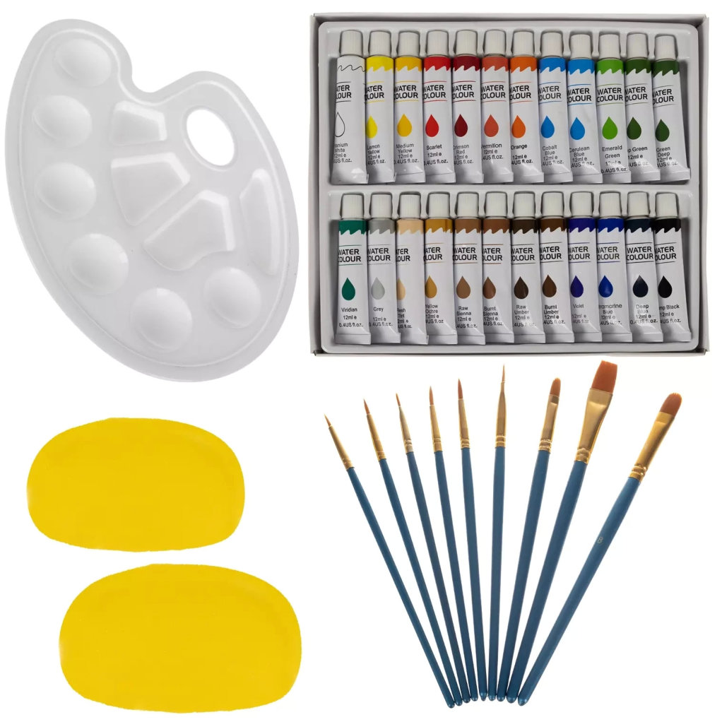 * Komplektis 46 osa – kohver-molbert, 24 akrüülvärvi tuubides, värvipalett, 9 erinevat pintslit, 5 värvispaatlit , 2 käsna, 3 lõuendit ja 1 A4 visandiplokk (50 lehte)