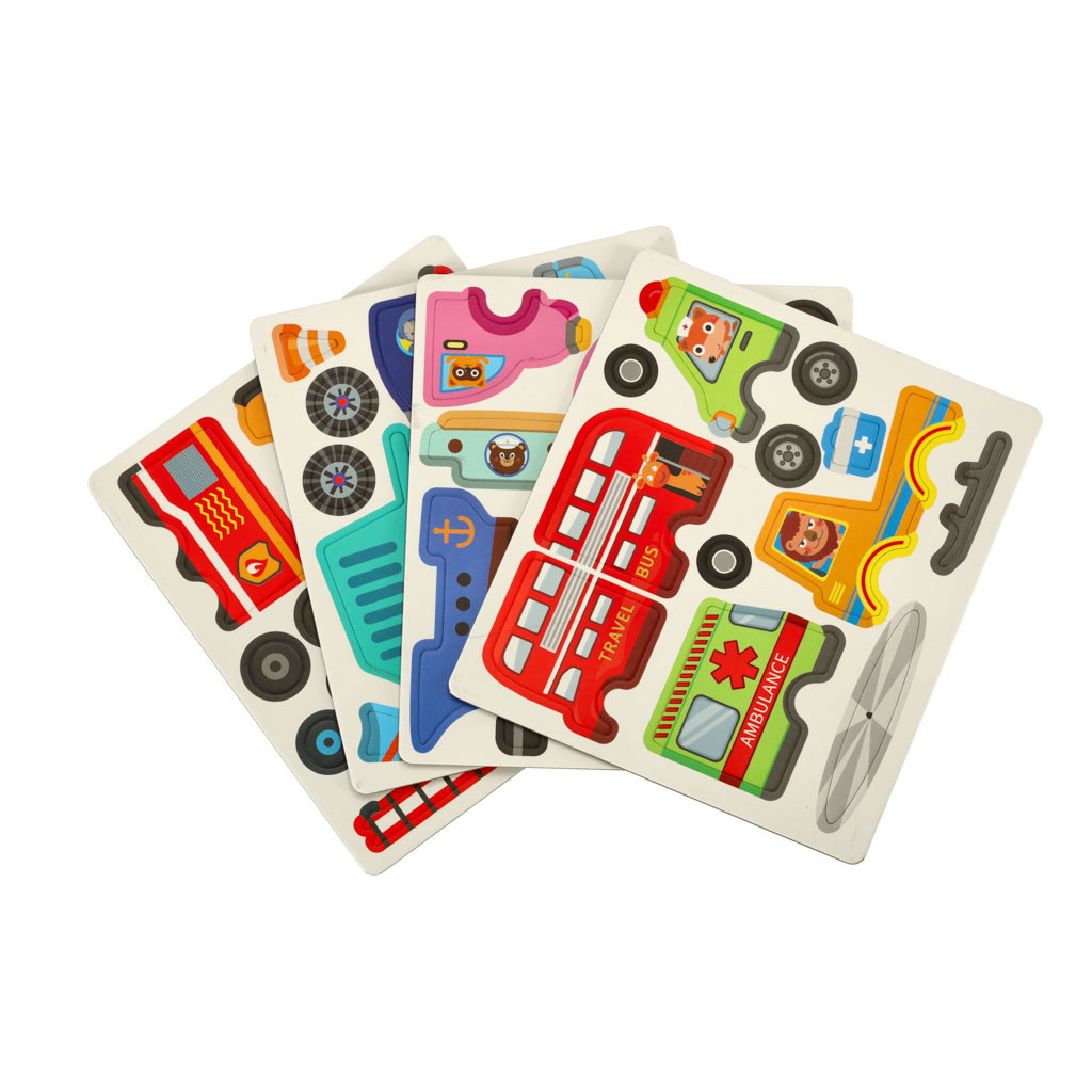 * Pakis ka pildikaardid, mille järgi on lapsel lihtsam tükke leida ja sõidukeid kokku sättida.
