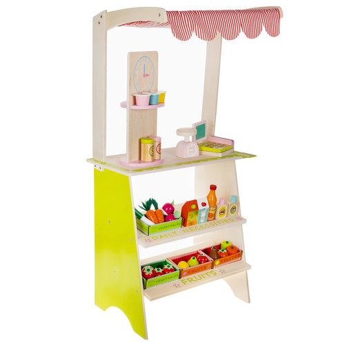 * Kaupade paigutamiseks on 2 suurt riiulit ning pööratav reklaamalus letil. Samuti on kaasas 4 kasti puu- ja juurviljade sorteerimiseks ja väljapaneku koostamiseks
