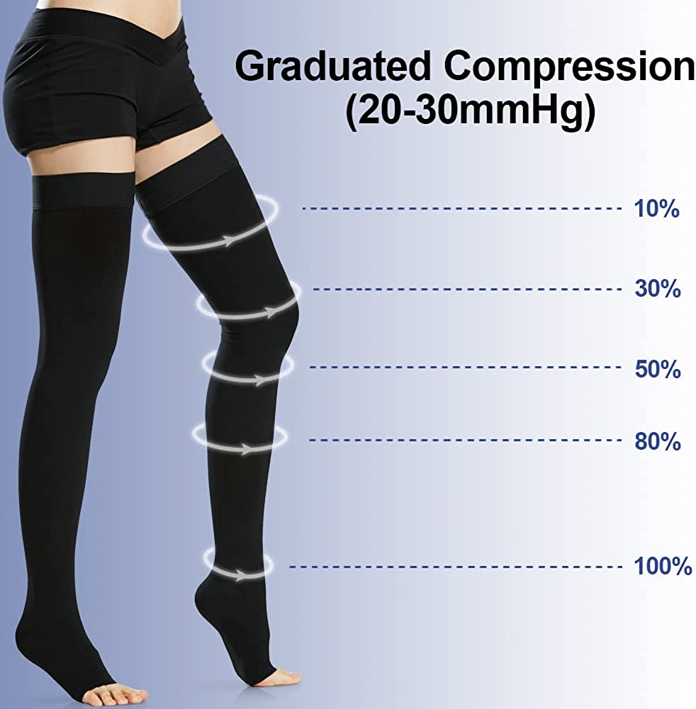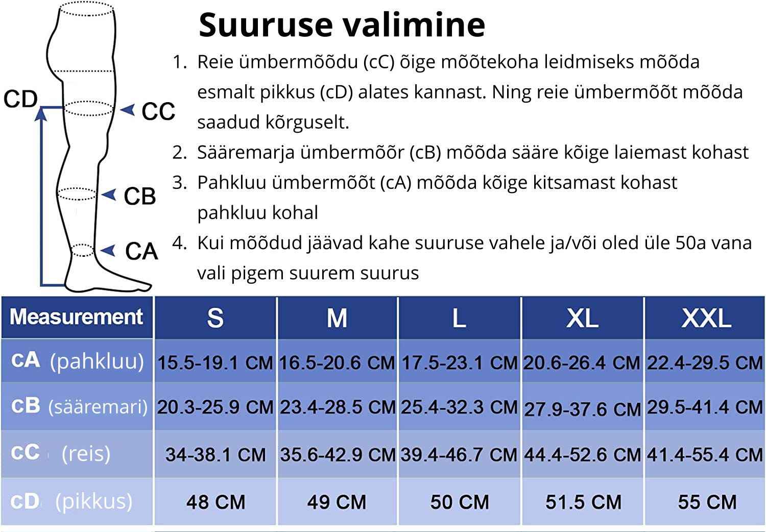 * Paljukiidetud 5-astmelise surve-profiiliga vahemikus 20-30mmHg – kõige suurem surve on pahkluu piirkonnale ning ülespoole liikudes surve järjest väheneb. See tagab hea vereringe ning kandjale maksimaalse mugavuse