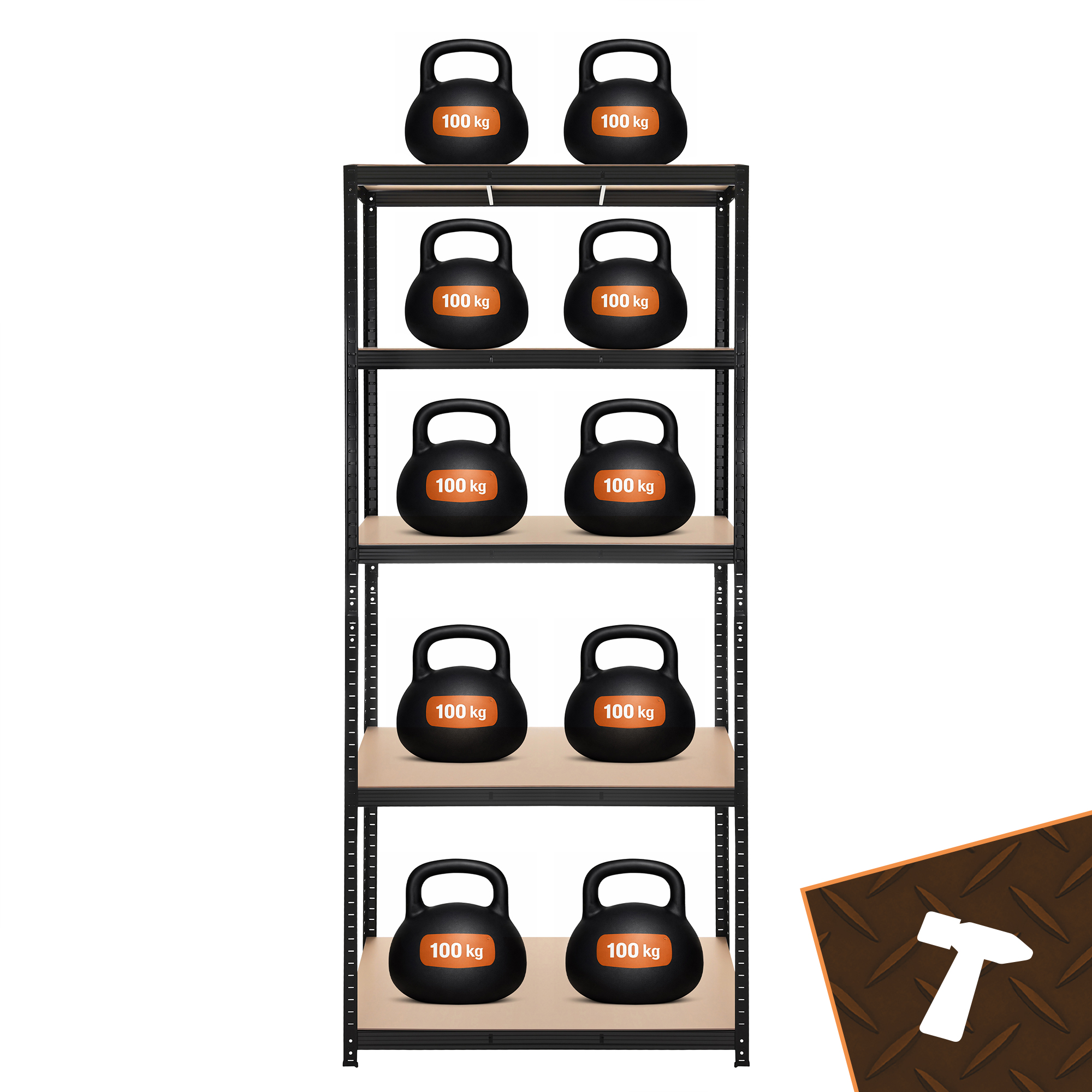 Tugev metallist hoiuriiul sobib hästi garaaži, keldrisse, lattu, tööruumi või arhiivi, kus on vaja hoiustada raskemaid ja mahukamaid esemeid korrastatult ning turvaliselt. Must pulbervärvitud teraskonstruktsioon, 5 MDF-riiulit ja tugevdusega riiulitasapinnad aitavad luua praktilise hoiulahenduse nii töö- kui ka kodukasutuseks. Tänu poltideta kokkupanekule ja reguleeritava kõrgusega riiulitele saab riiuli seadistada vastavalt enda vajadustele.