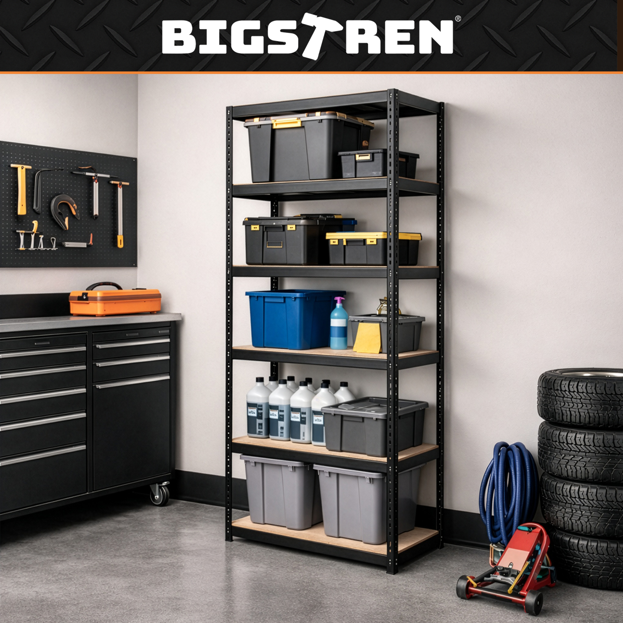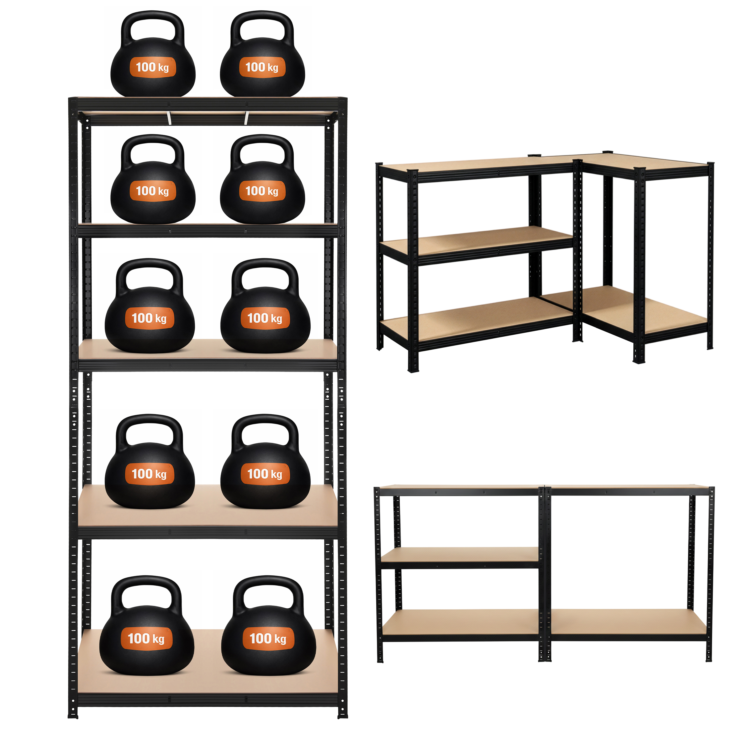 - Kuni 200 kg kandevõime ühe riiuli kohta – sobib raskemate tööriistade, kastide, rehvide, hoidiste, tarvikute ja muu varustuse hoiustamiseks