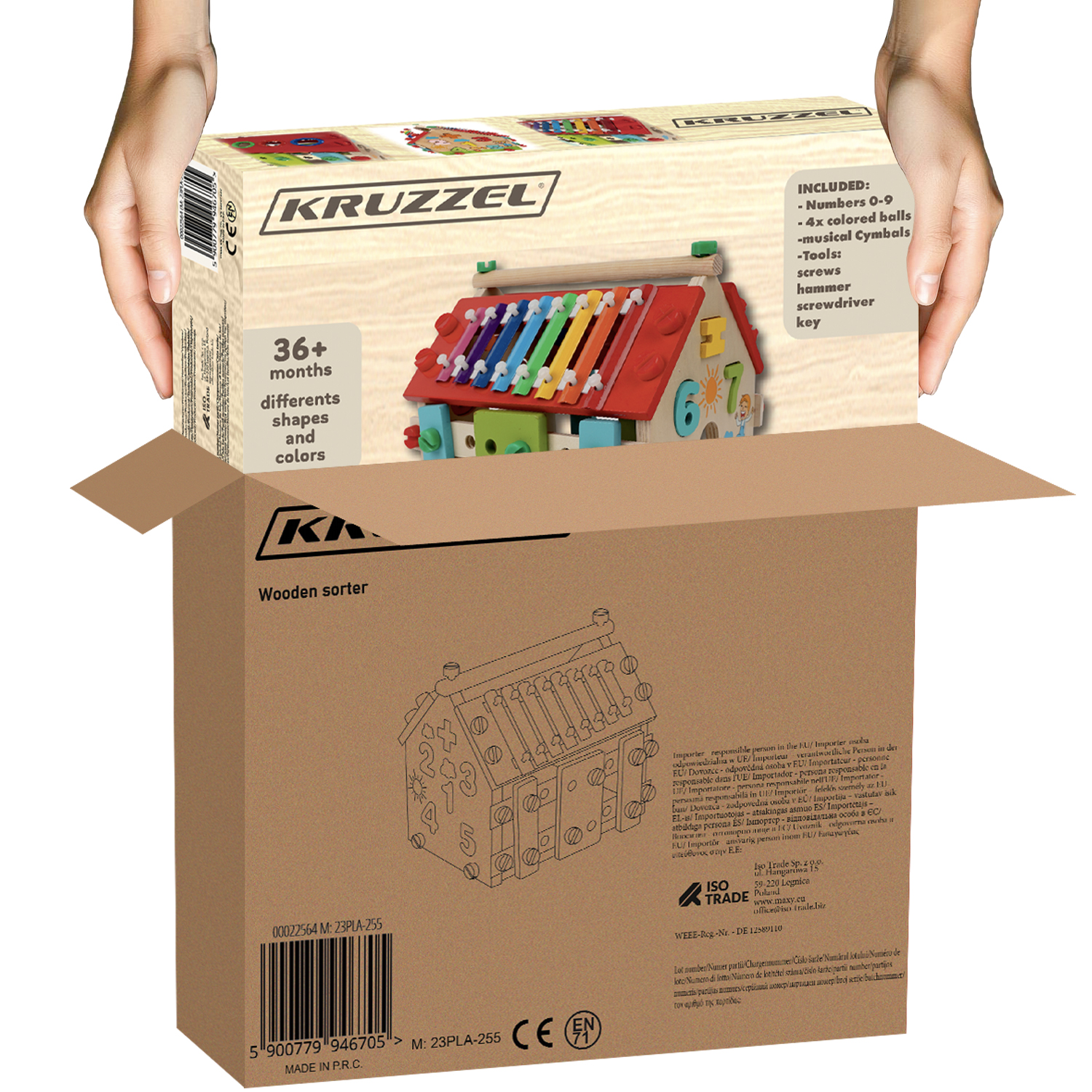 Mitmefunktsiooniline puidust hariv mängumaja ühendab õppimise ja mängu ühes komplektis. Iga külg pakub erinevat tegevust – kujundite sorteerimine, numbrid, haamrimäng ja ksülofon – toetades lapse loovust, motoorikat ja loogilist mõtlemist.