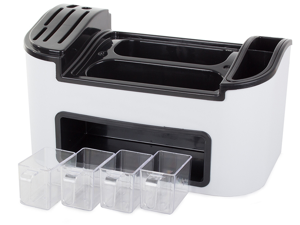 - Hoidik koosneb mitmest osast, mida saab hõlpsasti eemaldada ja puhastada. Alus toimib ka nõrutusrestina, hoides tööpinna kuivana.