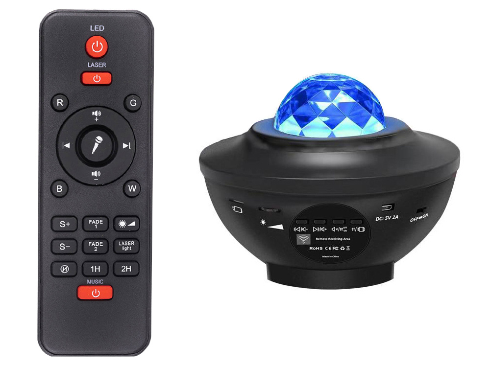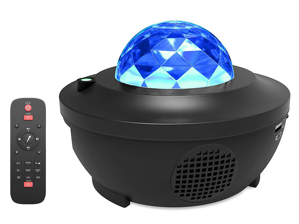 - Mitmevärvilised valgusefektid: Projektoril on neli põhivärvi (sinine, roheline, punane ja valge) ning erinevad valgustusrežiimid.
